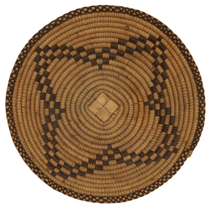 Papago Tray. 2" x 9". Four point morning star design in the center. Imbricated rim. C. 1900. (est $300-500)