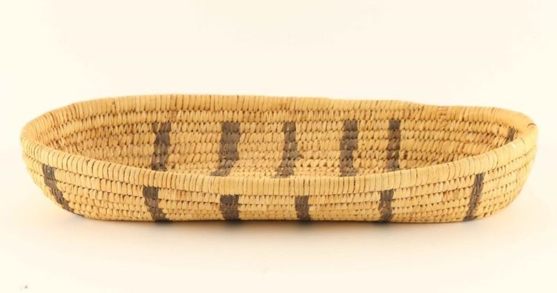 Oval tray with handles and black striped design. Good condition. Measures 13"x6 1/2"x2".