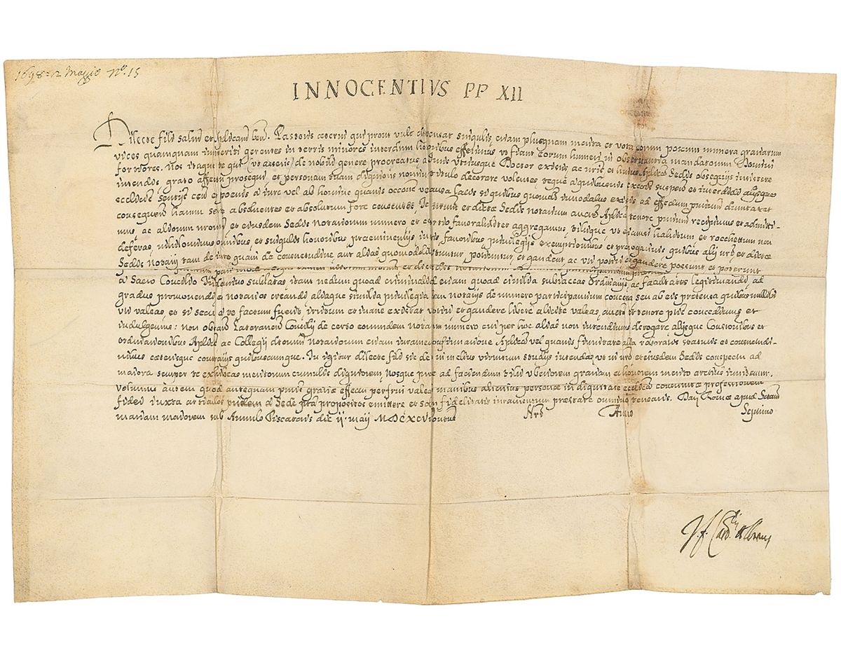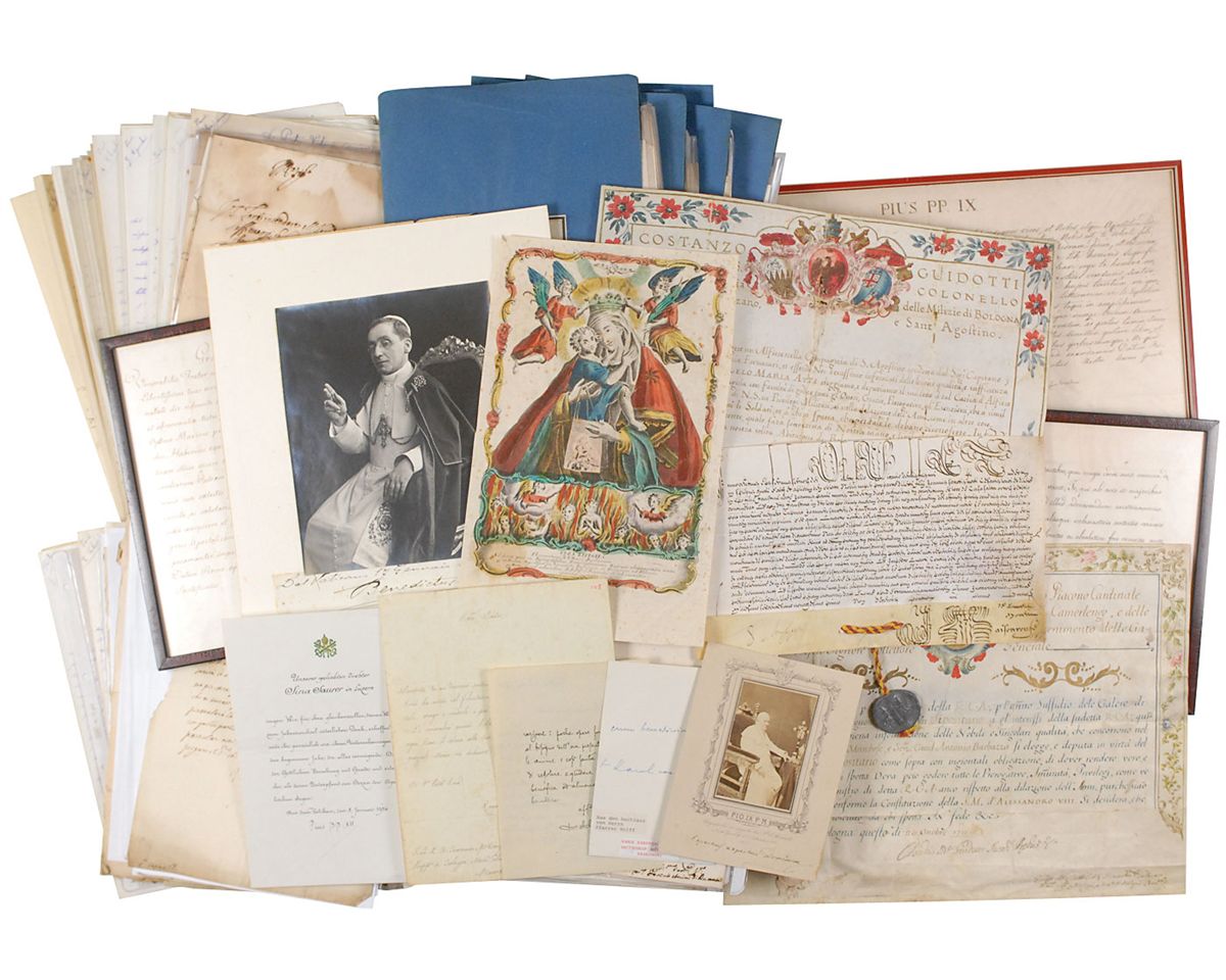 An amazing collection of over 400 letters, documents, and other various formats, spanning a remarkable seven centuries of church history, more than 100 of which are signed by popes. Supplementing the papal items is an enormous amount of material from cardinals, influential clergymen, and important church dignitaries. Of pieces signed by popes, the vast majority are letters and documents, plus a handful of signed photos from more recent pontiffs and a smattering of additional formats. Approximately 40% of these are signed as pope, with the other 60% signed as cardinal, bishop, or using their civilian names. Popes represented in this collection, as well as the quantity of items signed by them, include the following: Clement XI (1), Pius VI (1), Pius VII (7), Leo XII (4), Pius VIII (1), Gregory XVI (3), Pius IX (23), Leo XIII (5), Pius X (9), Benedict XV (3), Pius XI (10), Pius XII (23), Paul VI (16), and John Paul II (2). A more detailed breakdown of this group is available here. In overall very good to fine condition.