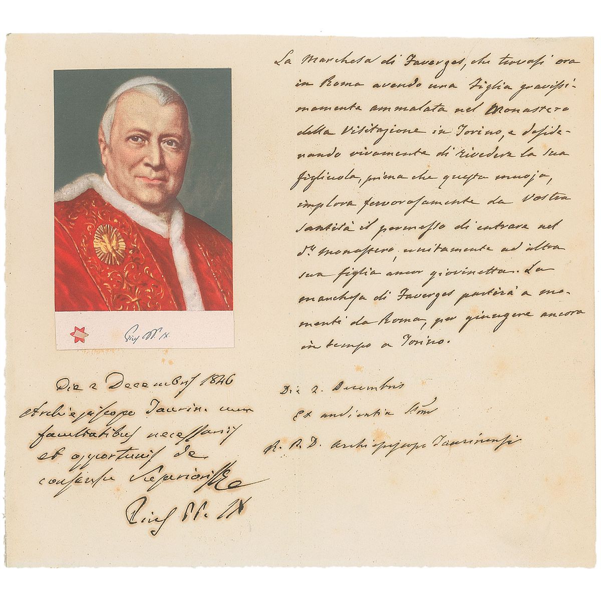 Pius IX (23, including two ALSs as archbishop dated 1832 and 1833; an LS as cardinal dated 1843; four ALSs dated 1844, 1845 (2), and 1864; six ANSs dated 1846, 1848, 1849, 1857 (2), and 1863; six LSs dated 1856, 1868, 1871, and 1873 (3); a signed photo dated 1870; a breve DS dated 1874; a papal bull dated 1874; and a photo bearing a handwritten dedication, circa 1888;