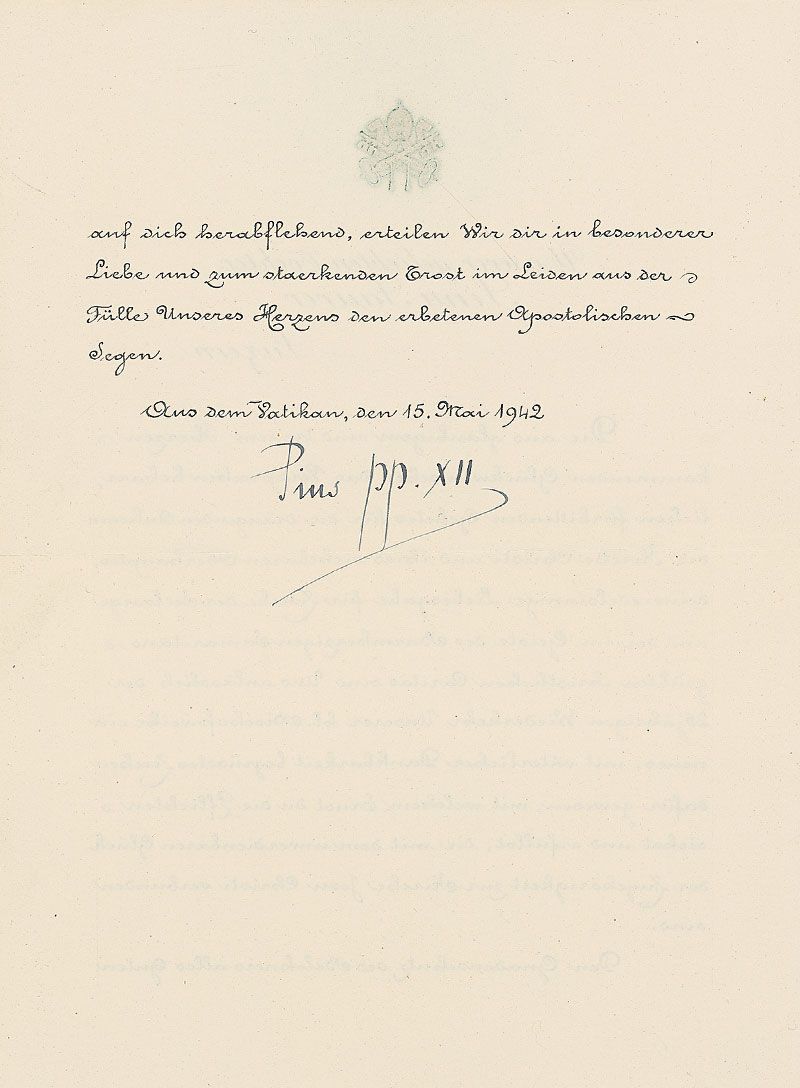Pius XII (23, including four ALSs dated 1921, 1922 (2), and 1928; TLS as diplomatic nuncio dated 1925; undated signature as diplomatic nuncio; ten TLSs as cardinal dated 1930 (2), 1932, 1933, 1934, 1935 (3), and 1936 (2); and seven LSs dated 1942, 1943, 1946, 1948, 1950 (2), and 1954);