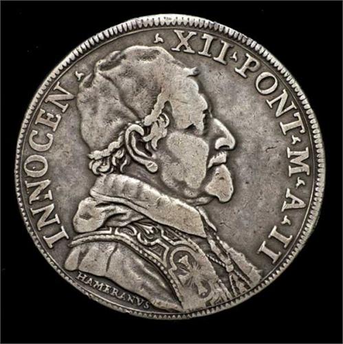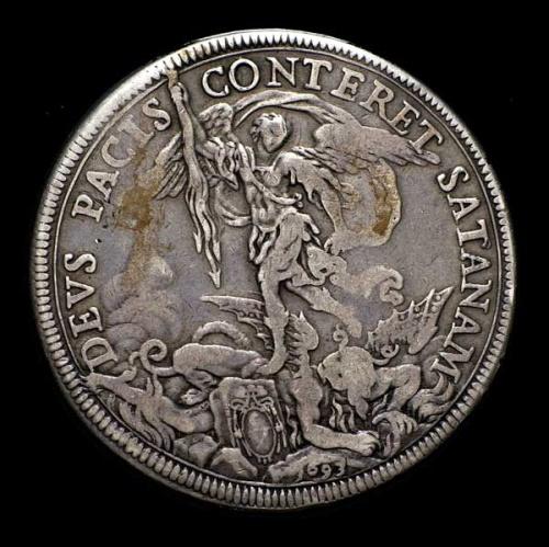 Stato Pontificio - Innocenzo XII (1691-1700) - Piastra 1693 anno II - Zecca: Roma - Diritto: effigie del Papa a destra - Rovescio: l'Arcangelo Michele ad ali aperte sovrasta Lucifero e lo colpisce con il fulmine - gr. 31,13 - Di qualità modesta ma privo di tracce di montatura - Da esaminare
