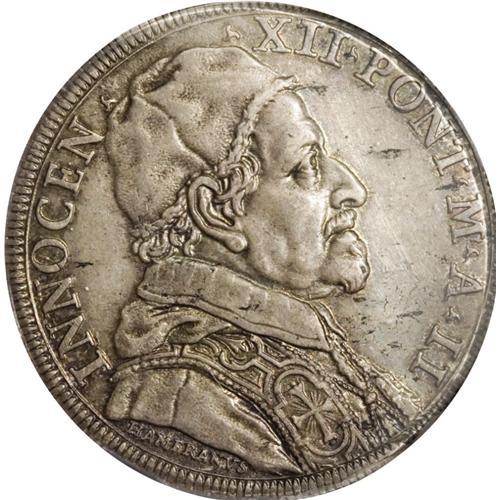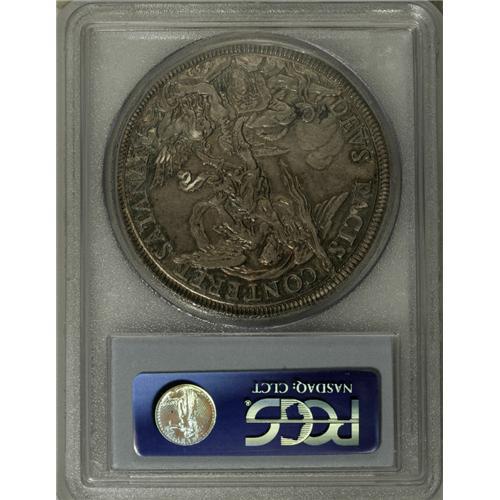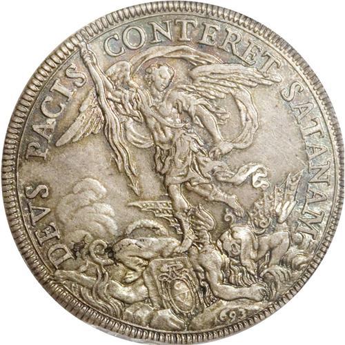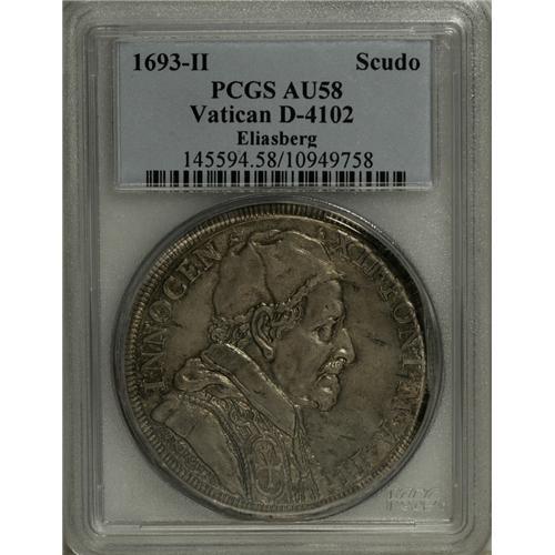 <B>Papal States. Innocent XII Piastra Year II (1693), </B></I>KM557, Davenport 4102, Berman 2225, AU58 PCGS Eliasberg, beautifully toned, the reverse depicts St. Michael defeating Satan.<BR><I>From the Louis E. Eliasberg, Sr. Collection</B></I><BR><BR><b>Shipping:</b> Coin/Currency (<a target="_blank" href="http://www.heritageauctions.com/common/shipping.php">view shipping information</a>)