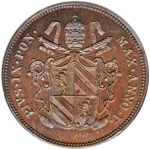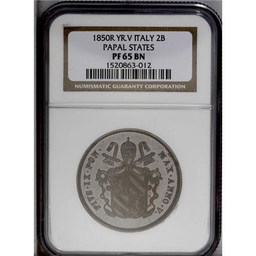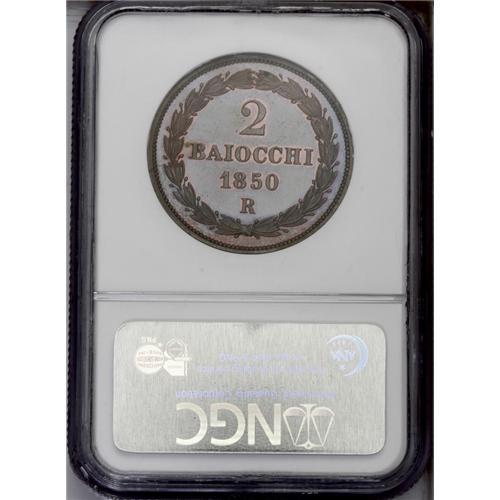 <B>Papal States. Pius IX Proof 2 Baiocchi 1850R year 5,</B></I> KM1344 (unlisted in Proof), Proof 65 Brown NGC. Superbly struck with mirror-like fields. Extremely rare.