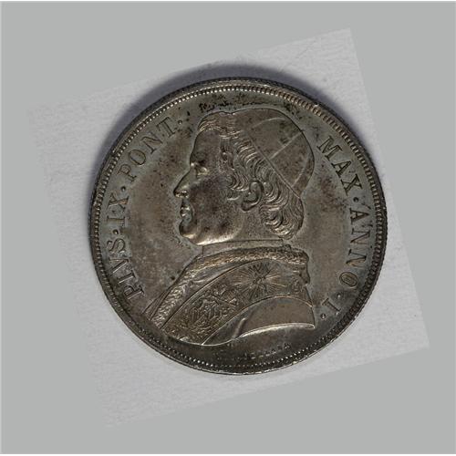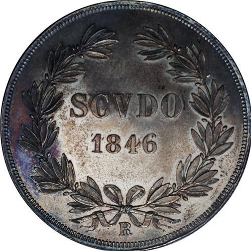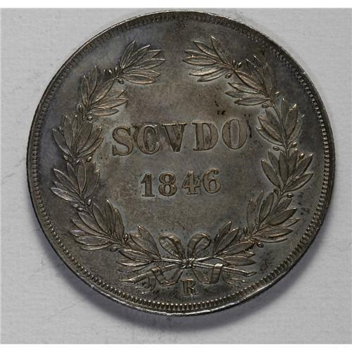 <B>Papal States. Pius IX Scudo 1846R, </B></I>KM1336.1, choice toned UNC with reflective surfaces, rare date with only 1,820 minted.There are a couple of tiny flan flaws (as made), barely noticeable.<BR><I>From the Monedas Oro Collection</B></I><BR><BR><b>Shipping:</b> Coin/Currency (<a target="_blank" href="http://www.heritageauctions.com/common/shipping.php">view shipping information</a>)