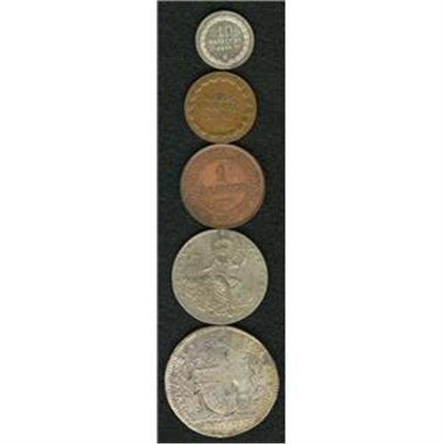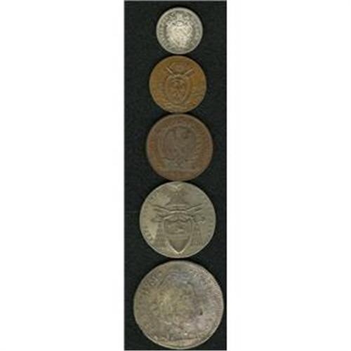 <B>Papal States. Selection of Types, </B></I>five pieces featuring: Bologna 10 Paoli 1797, VF with surface oxidation, Sede Vacante 1/2 Scudo 1829B, VF, tiny mount trace at the top, 1/2 Baiocco 1824B, choice brown AU, 10 Baiocchi 1856R, AU-UNC and Roman Republic Baiocco 1849R, superb red and brown UNC. <B>Sold as is, no return lot.</B></I><BR><I>From the Blue Ridge Collection</B></I><BR><BR><b>Shipping:</b> Coin/Currency (<a target="_blank" href="http://www.heritageauctions.com/common/shipping.php">view shipping information</a>)