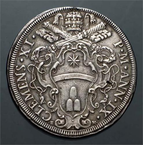 Papal coins - Clemente XI (1700-1721) - Piastra Anno IX - Zecca di Roma - gr. 31,77 - Traccia di appiccagnolo - Da esaminare - Ag