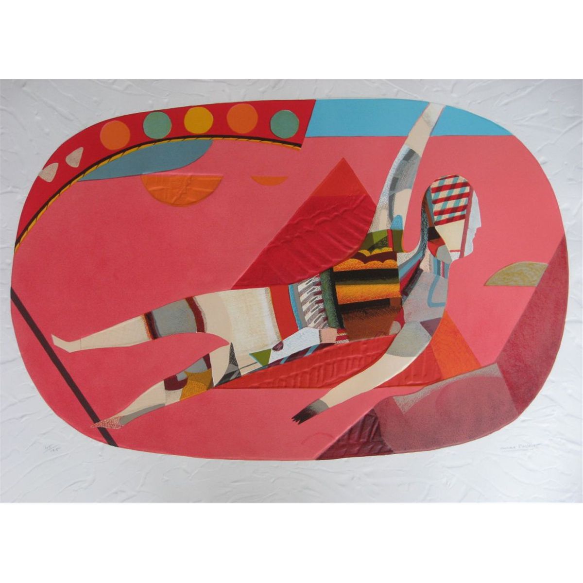 Papart’s style of cubism is upbeat, and he bathed his works in the light and bright colors of the French Riviera where he was born. His favorite subjects included circus scenes, flirting couples, soaring birds and similar cheerful subjects. He typically overlapped planes of brilliant colors and by introducing collage in his prints created contrasting textures.