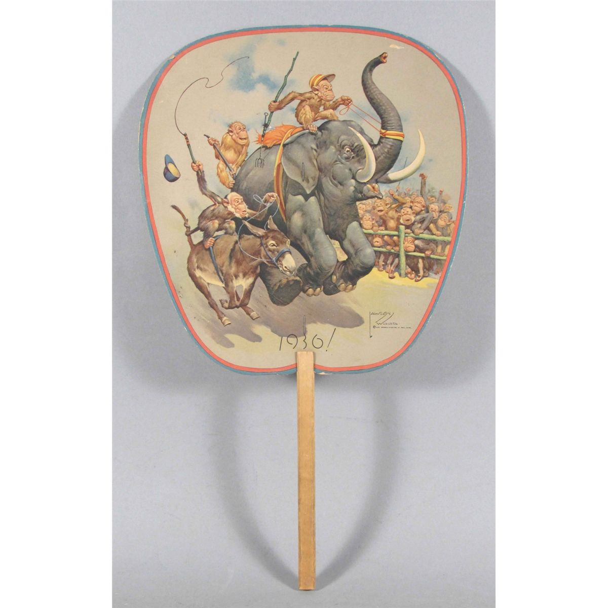 Paper Advertising Fan for Allan Shoe Stores. Hazelton-Freeland-Tamaqua. Depicting monkeys racing on a mule and elephant, dated 1936. Lawson Wood, artist. Minor rub at 1:00 otherwise excellent condition. Start Price $40