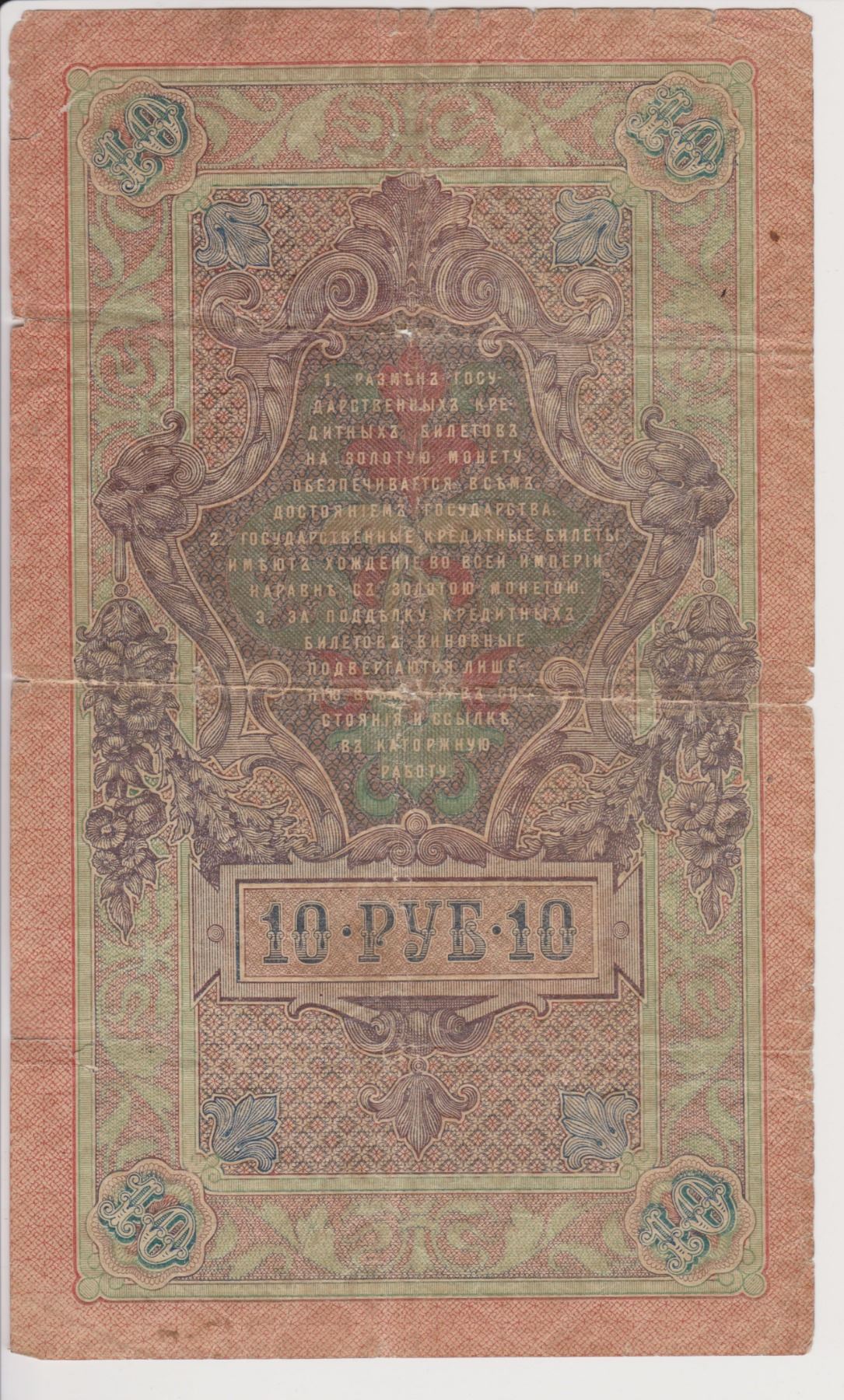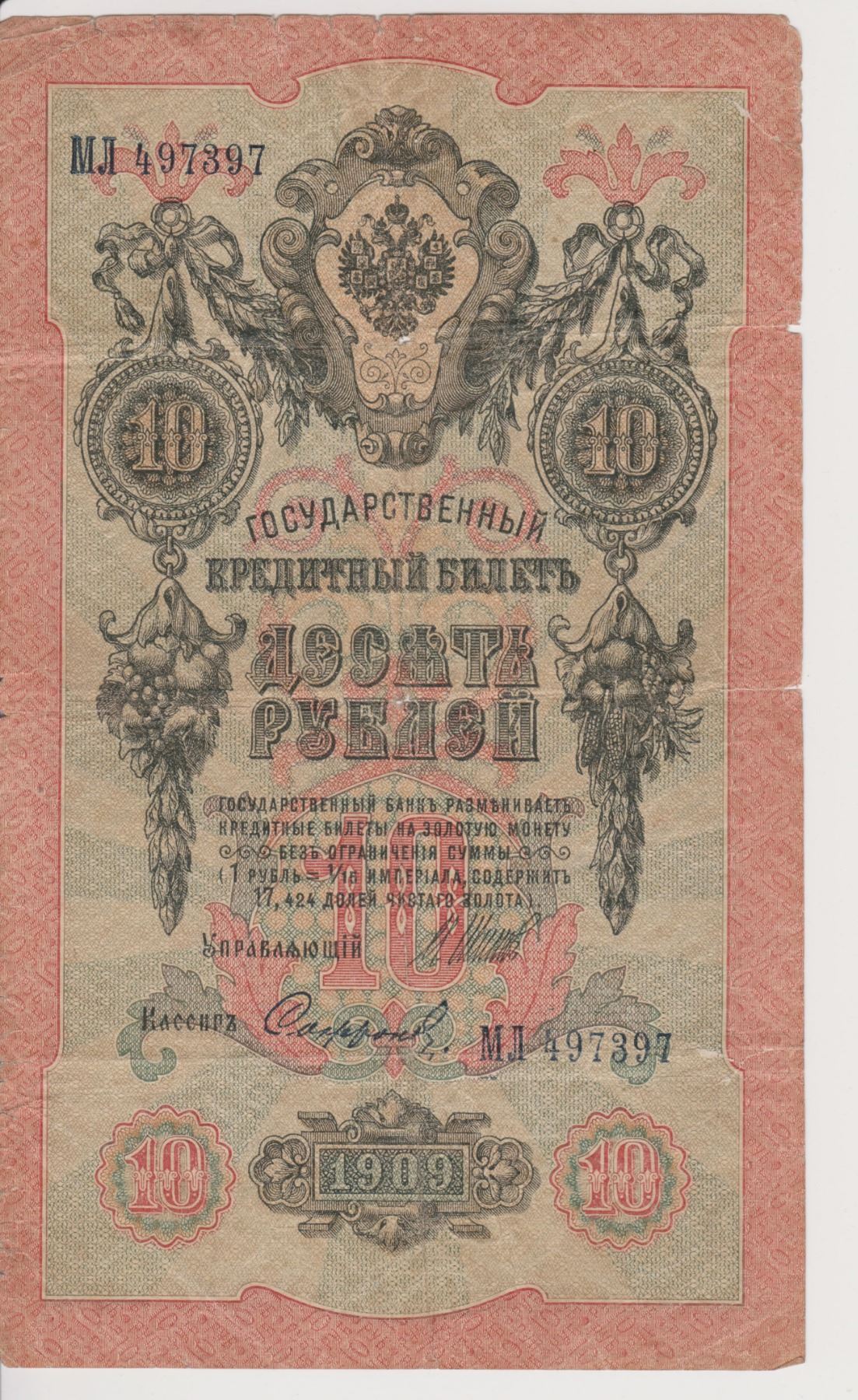 Paper Currency Russia 10 ruble form 1909 Tzar Nicholas era. Note in fairly nice condition considering age, quite scarce
