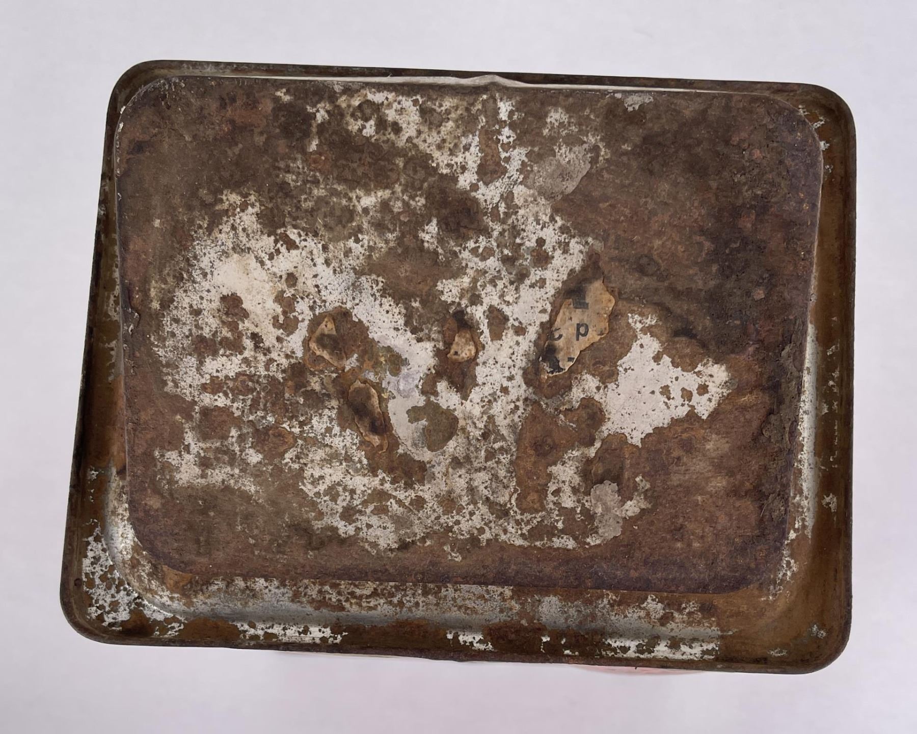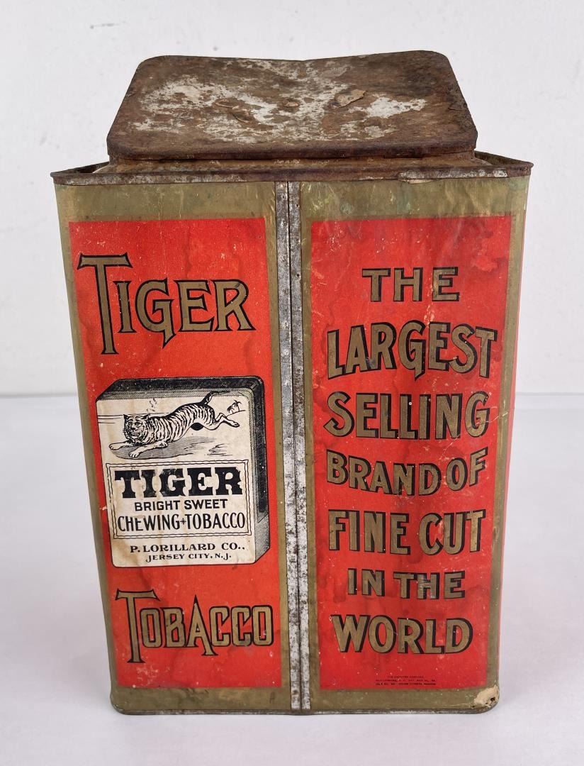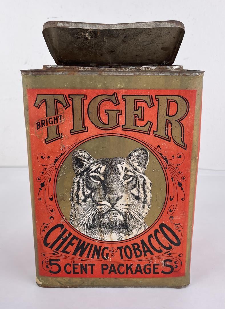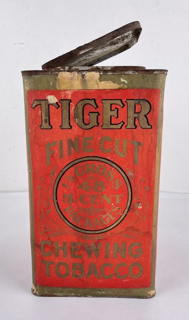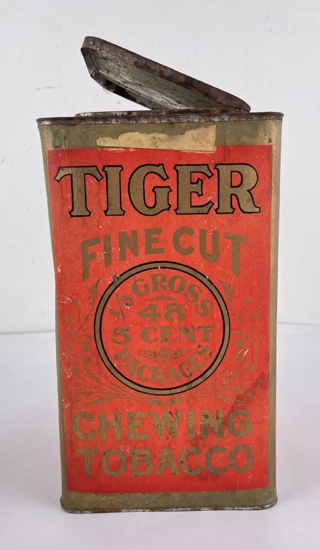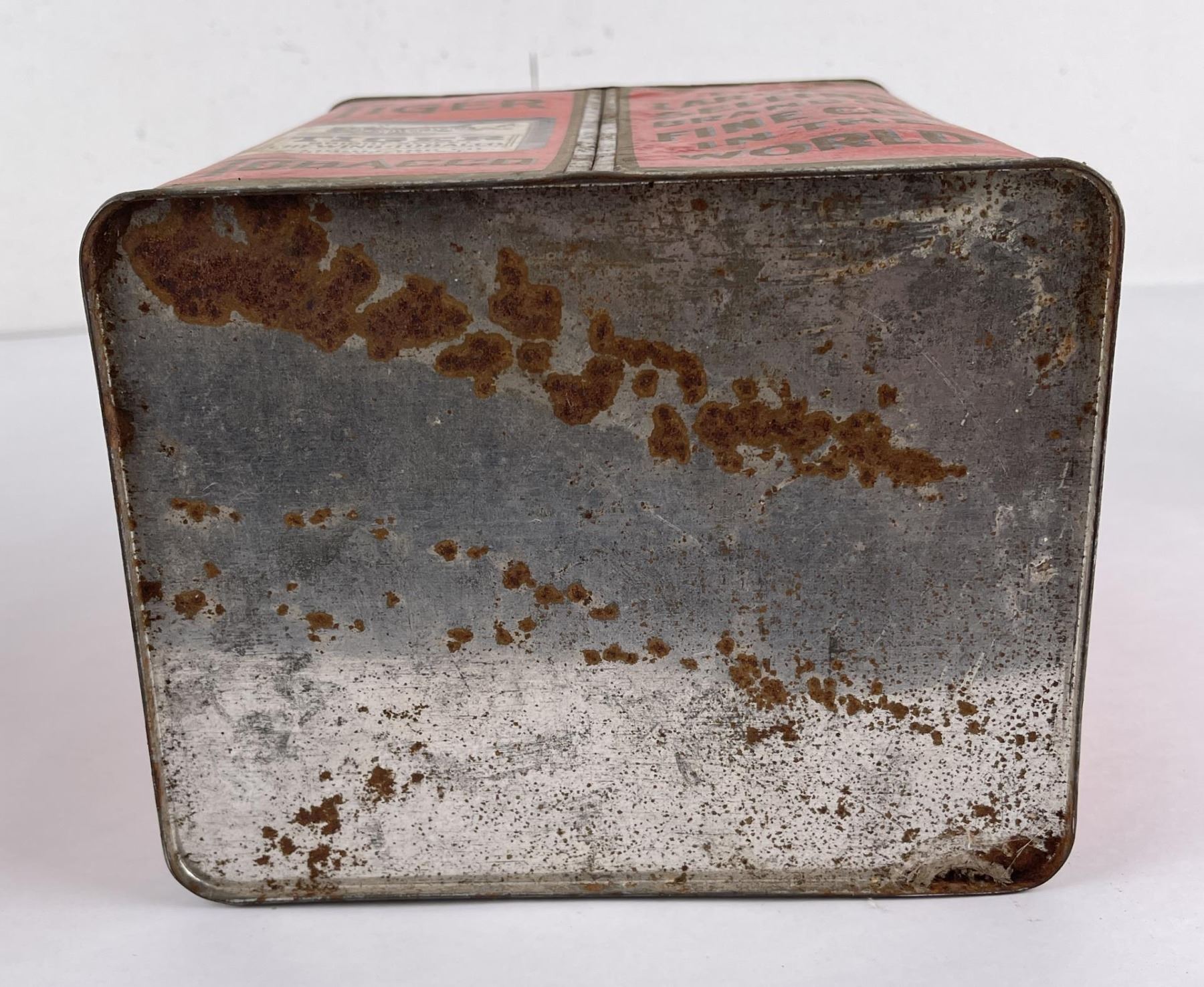 Very nice old tin. Paper label. Store sized with 5 cent packages advertised. 11" tall.