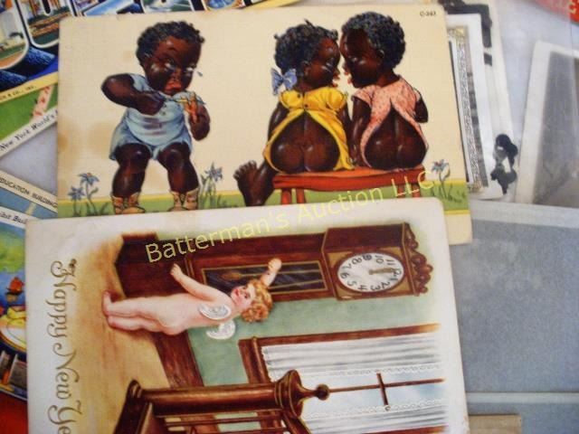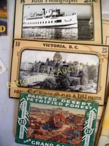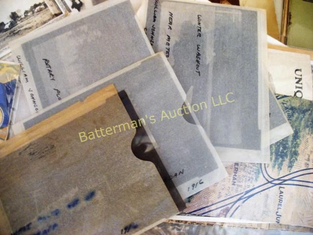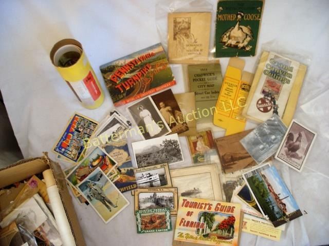 Mixed lot, calendars, film negatives, cards, postcards, letters, Mother Goose book, mini card books and old letter opener; other photo items.
