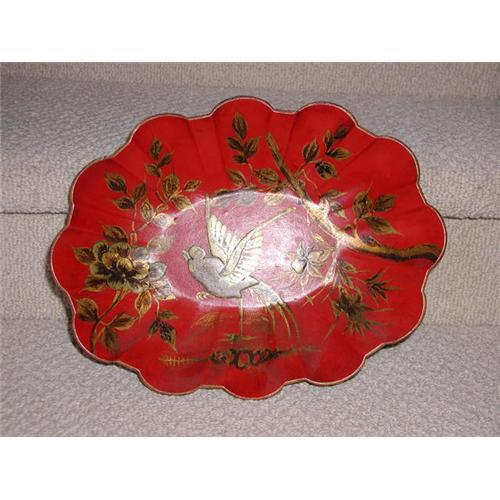 English Paper Mache Bread Tray. Rare Red color with Gold oriental style designs. There is a Large Gold Bird in the center of the tray. Some of the gold on the bird, as well as the rim, has lightened. No chips or cracks. Great on a table or hung on the wall. Very elegant