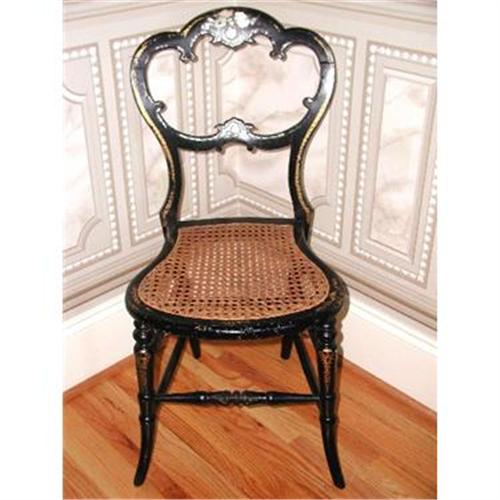 French Napolean III C.1850-60 paper mache black lacquered chair has hand painted designs in gilt on back,sides,front spindle and knees. Inlaid across the back in mother of pearl designs. Caned seat in excellent condition as is the entire chair with exception to small spots of mother of pearl missing on the back. Measures 32H X 16L X 14D.