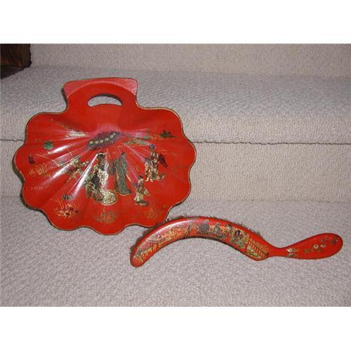 English Paper Mache Crumber with Matching Brush. This Crumber is larger than most and the Brush is very long. The pair are orange in color with a Gold oriental style gold motiff. Excellent condition with no chips or cracks. A must have decorative piece. These are very hard to find especially in such great shape.