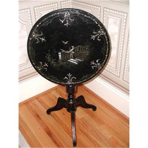 C.1850 French Napoleon III black paper mache tilt top table is inlaid with mother of pearl in the intricate design surrounding the top as well as accents within. Beautiful painting of two young boys feeding the birds with a large tray on an elegant garden stairway. The hand painting is a perfect combination of the two with a more faint painting visible for distance objects such as the trees and floral in the background. Gilt scroll painting on the three legs and pedestal. Tilts with the aid of a brass knob beneath. All mother of pearl in tact,the painting preserved perfectly as well. In excellent condition. Measures 18W X 18L X 24H when open,33H upright.