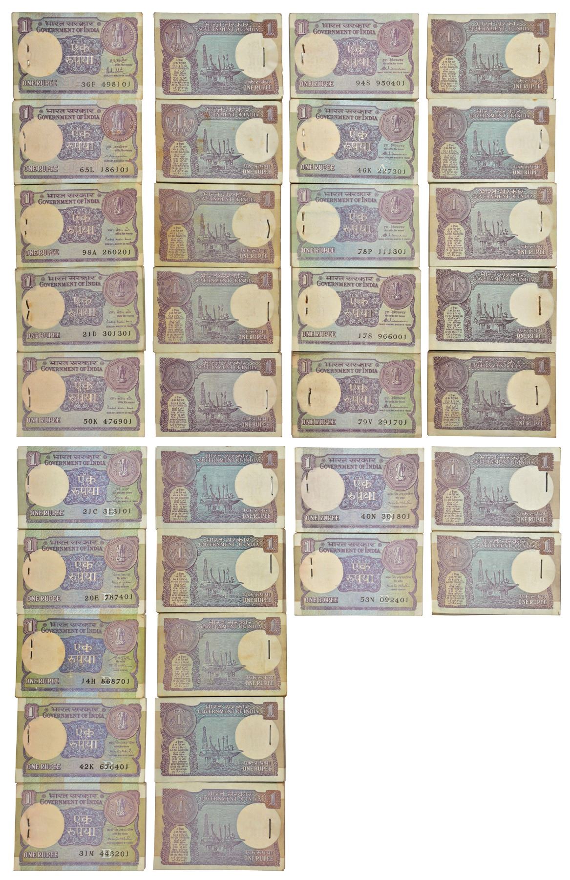 1 rupee, 17 full packets of 100 notes each, includes Phila India Paper Money book no. A43-1981, A44-1981, A45-1983, A46-1984, A47-1985, A48-1985, A49-1986, A50-1987, A51-1988, A52-1989, A53-1989, A54-1990, A55-1991, A56-1991, A57-1992, A58-1993 and A59-1994, all are different. (17 packets)
