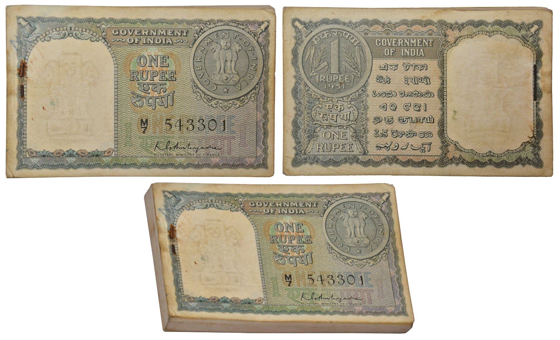 1 rupee, 1951, full packet of 100 notes, signed by K.G. Ambegaonkar, serial no.: M7 543301 to 543400, J&R 6.1.2.1. (100 notes)