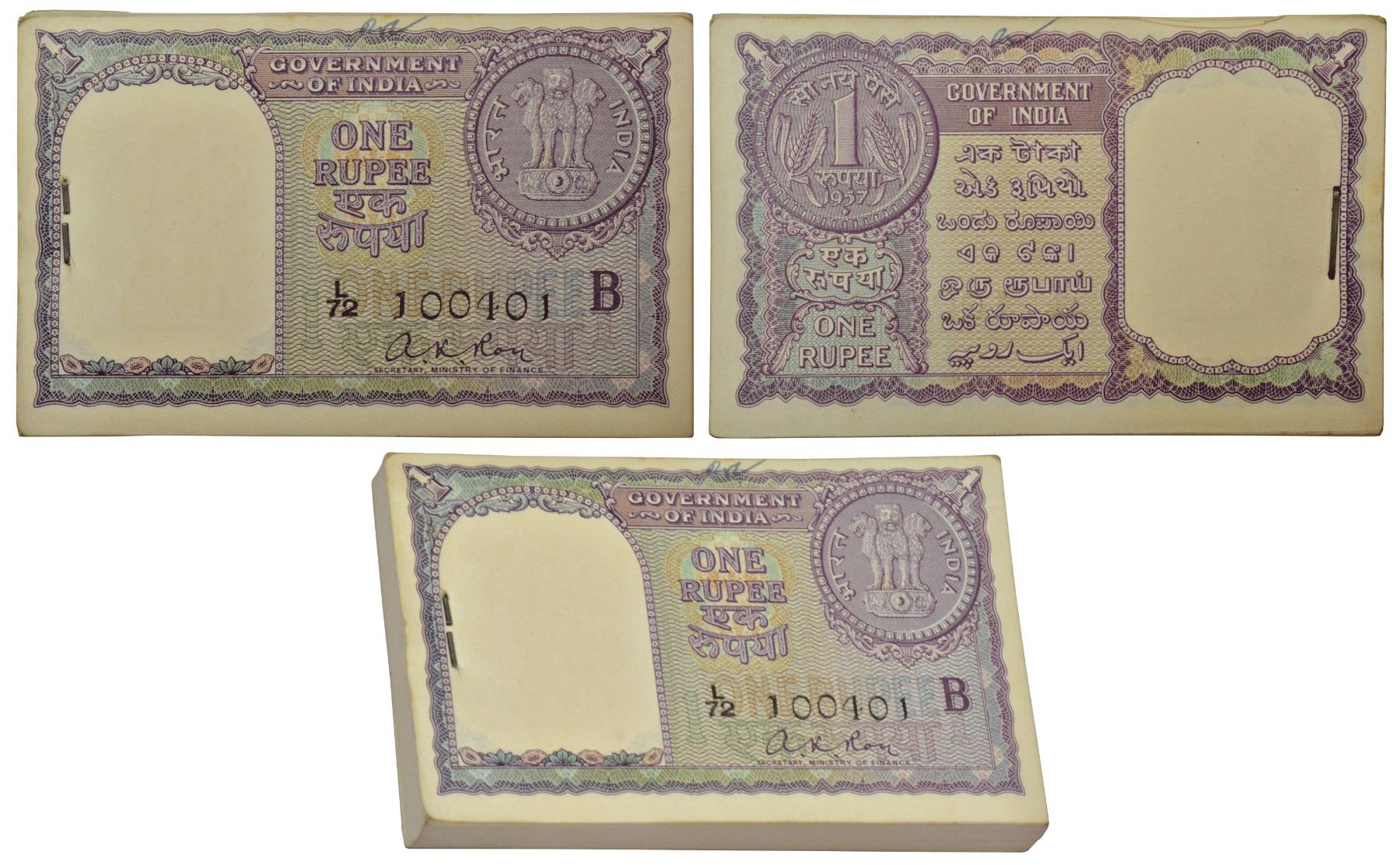 Paper Money: 1 rupee, 1957, full packet of 100 notes, signed by A.K. Roy, inset 'B'