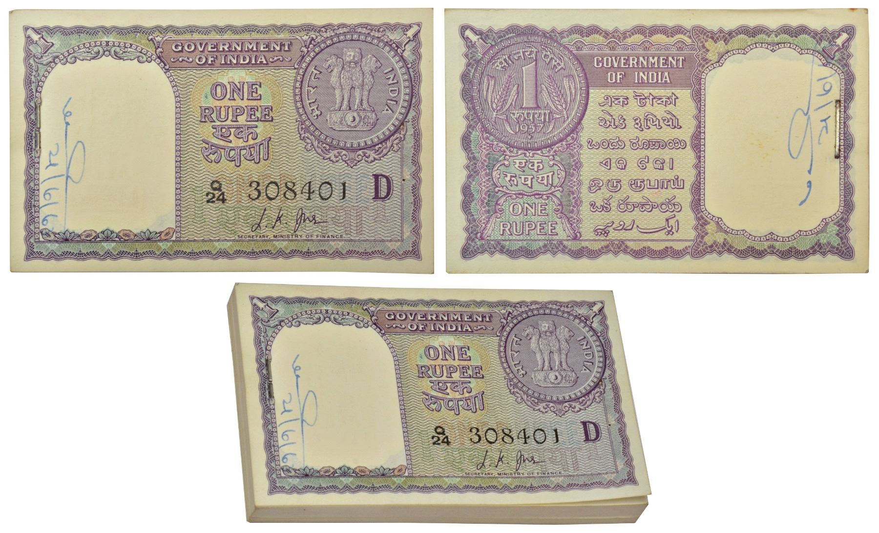 1 rupee, 1957, full packet of 100 notes, signed by L.K. Jha, inset 'D', serial no.: Q24 308401 to 308500, J&R 6.1.4.3C. (100 notes)