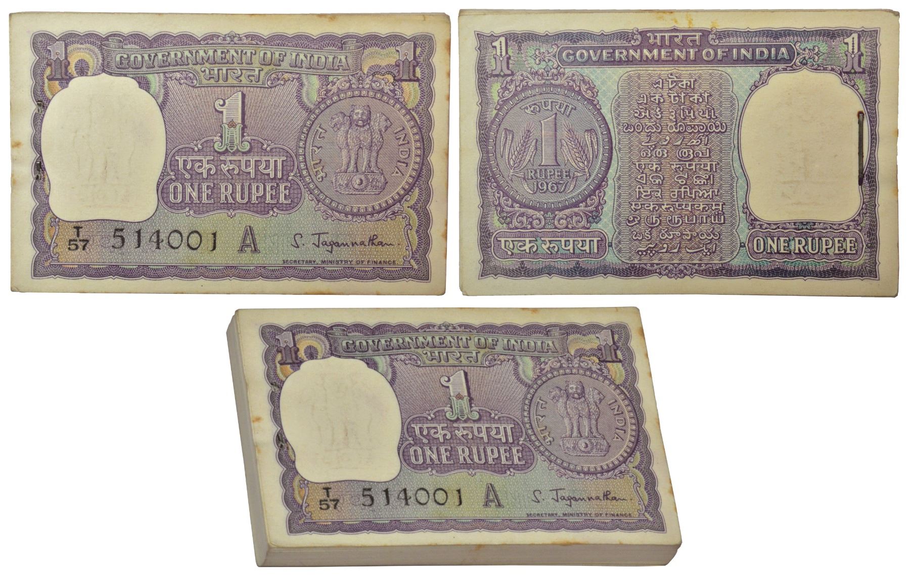 1 rupee, 1967, full packet of 100 notes, signed by S. Jagannathan, inset 'A', serial no.: T57 514001 to 514100, J&R 6.1.6.2A, stain marks on edge. (100 notes)