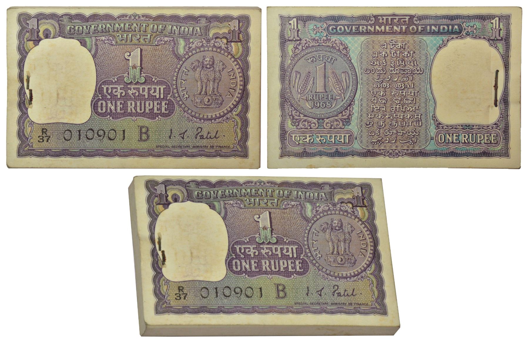1 rupee, 1968, full packet of 100 notes, signed by I.G. Patel, inset 'B', serial no.: R37 010901 to 011000, J&R 6.1.6.3A. (100 notes)