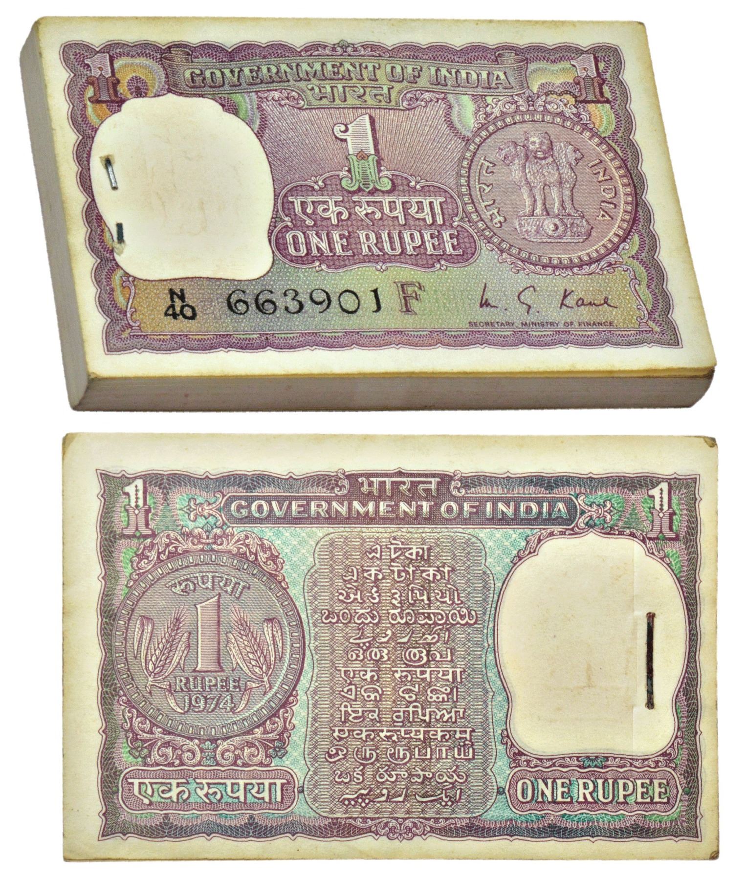 Paper Money: 1 rupee, 1974, full packet of 100 notes, signed by M.G. Kaul, inset 'F',