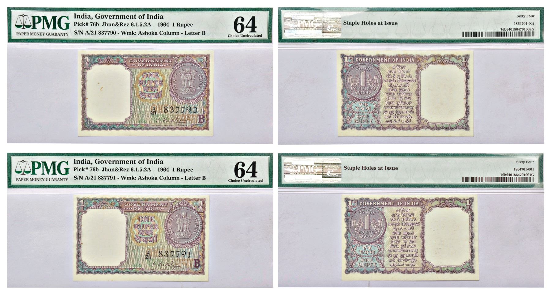 1 rupee (2), 1964, signed by S. Bhoothalingam, inset 'B', two consecutive serial no.: A21 837790 and 837791, J&R 6.1.5.2A. (2 notes)