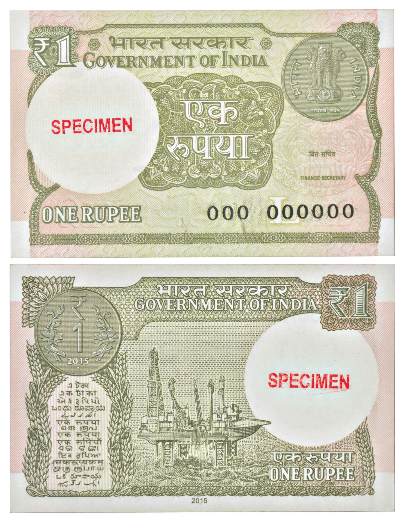 1 rupee, 2015, SPECIMEN, unsigned by Finance Secretary, inset 'L', serial no.: 000 000000.