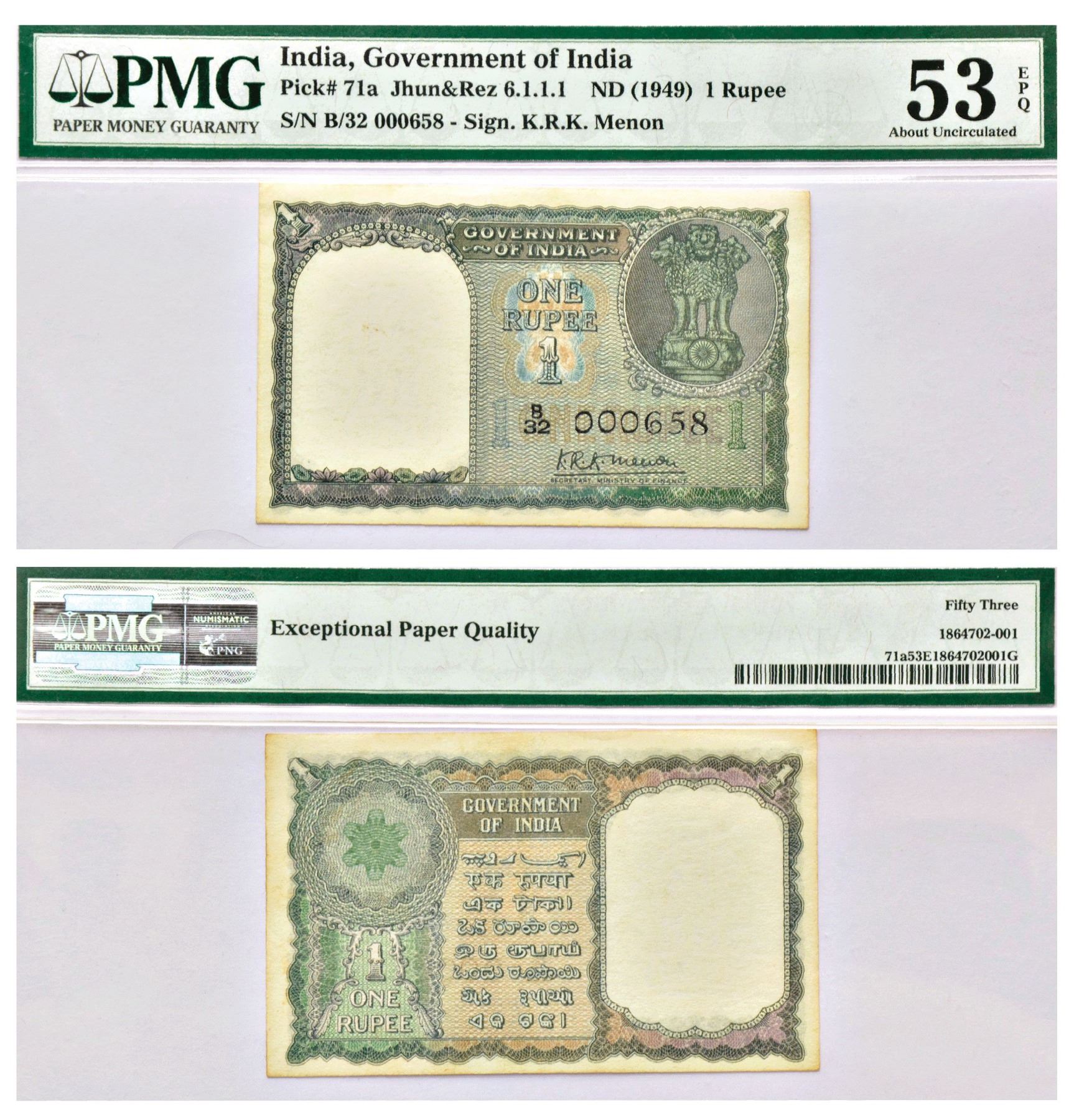 1 rupee, ND (1949), signed by K.R.K Menon, lower serial no.: B32 000658, J&R 6.1.1.1.