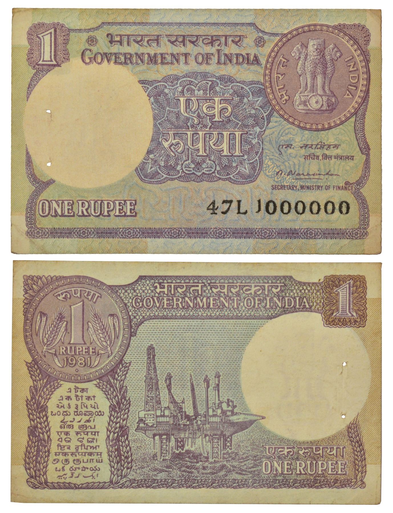 1 rupee, fancy number, 1981, signed by M. Narasimham, without inset, serial no.: 47L 1000000 (1 million), J&R 6.1.9.2.