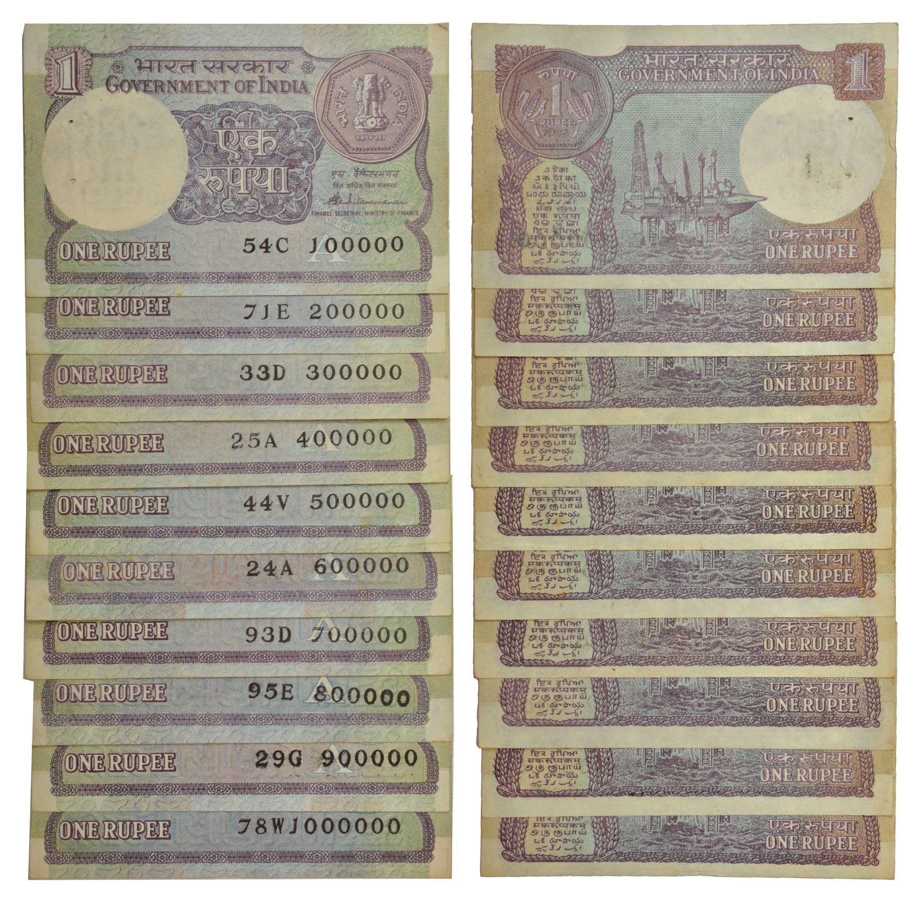 1 rupee, fancy number set of 10 notes, serial no.: 100000 to 1000000, 2x signed by Pratap Kishen Kaul- dated 1984, serial no. 200000 & 300000; 8x signed by S. Venkitaramanan- dated 1985, serial no. 500000 & 1000000 (1 million), dated 1986, serial no. 100000, 400000, 600000, 700000, 800000, 900000, few notes have minor stain mark. (10 notes)