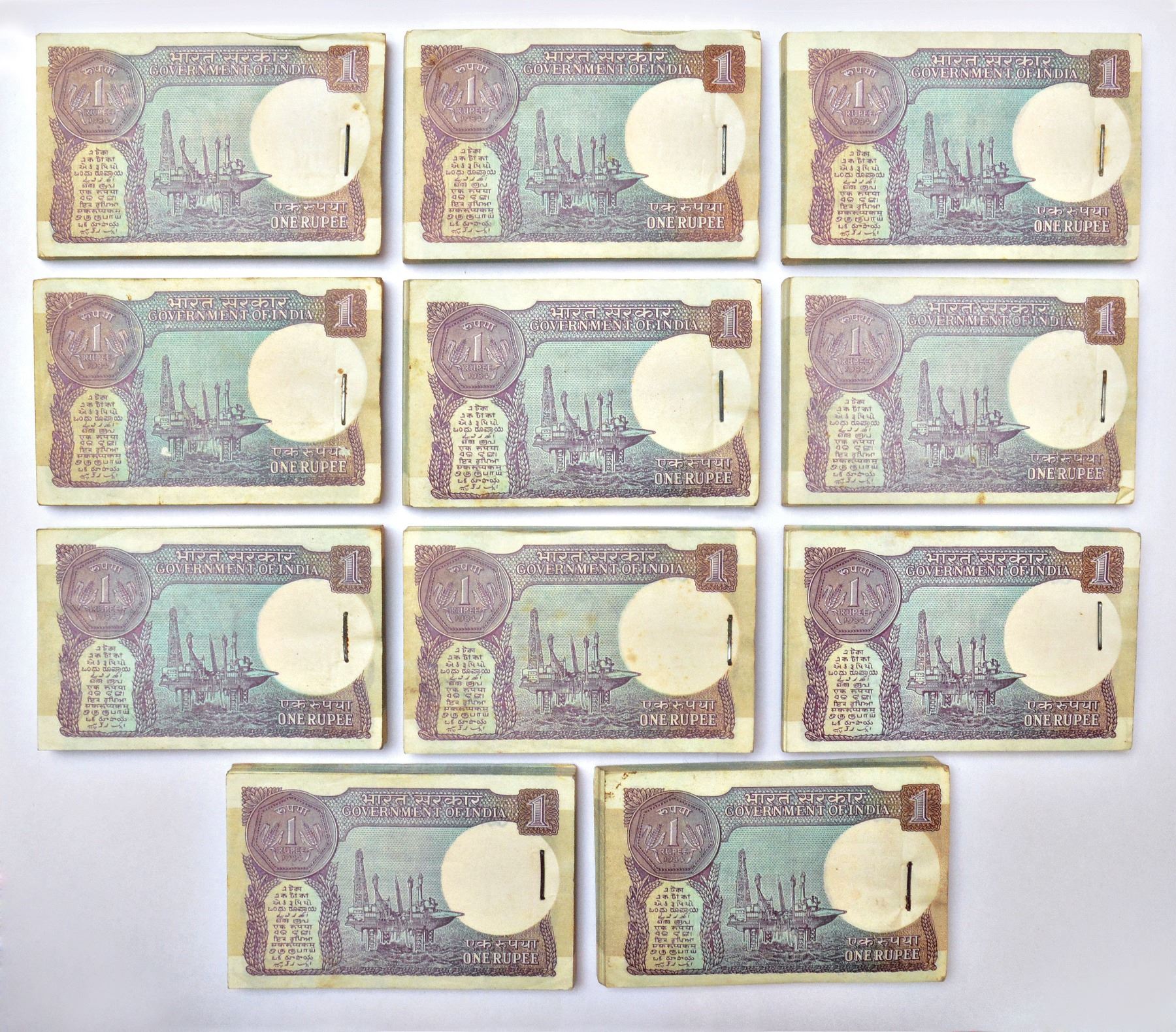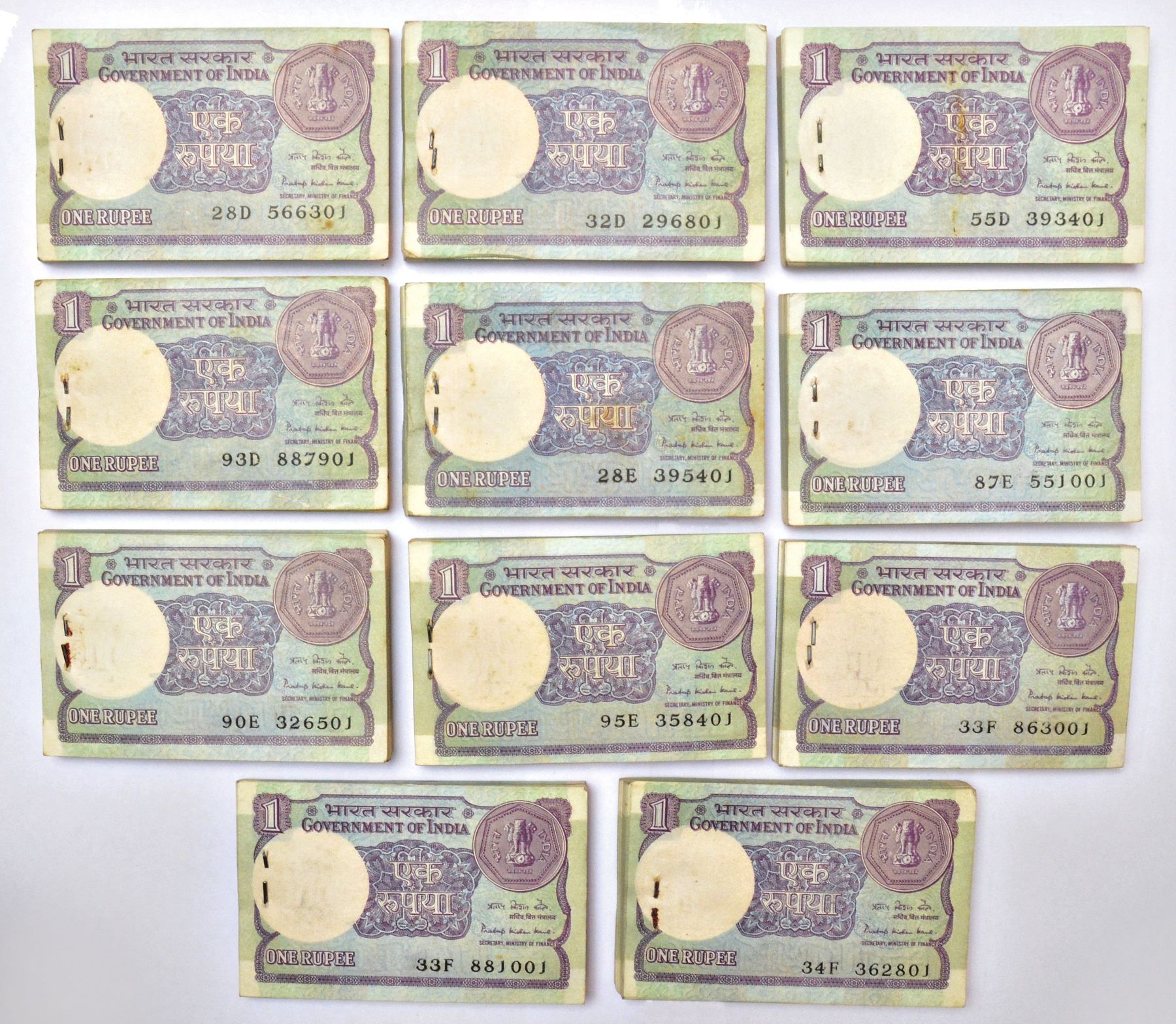 1 rupee, full packet of 100 notes (11), 1984, signed by Pratap Kishan Kaul, without inset, serial no.: 28D 566301 to 566400, 32D 296801 to 296900, 55D 393401 to 393500, 93D 887901 to 888000 (last serial number are semi fancy), 28E 395401 to 395500, 87E 551001 to 551100, 90E 326501 to 326600, 95E 358401 to 358500, 33F 863001 to 863100, 33F 881001 to 881100 (last note are Jodi no) and 34F 362801 to 362900, three different prefix, J&R 6.1.10.1B. Some notes have stain marks, (11 packets)