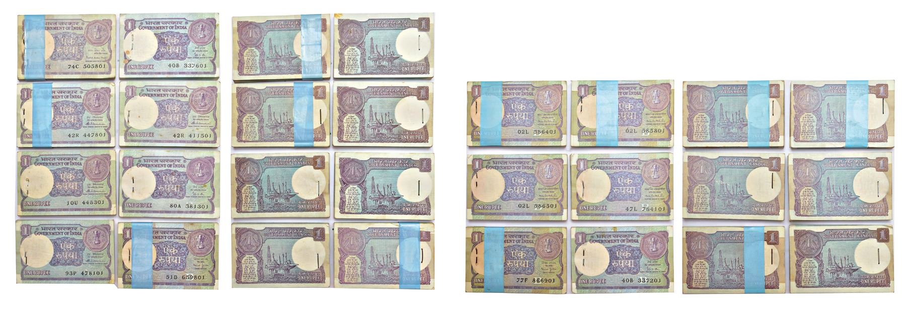 Paper Money: 1 rupee, full packet of 100 notes (14), 1x 1984, 3x 1985, 1x 1987, 3x 1989, 2x 1990 and