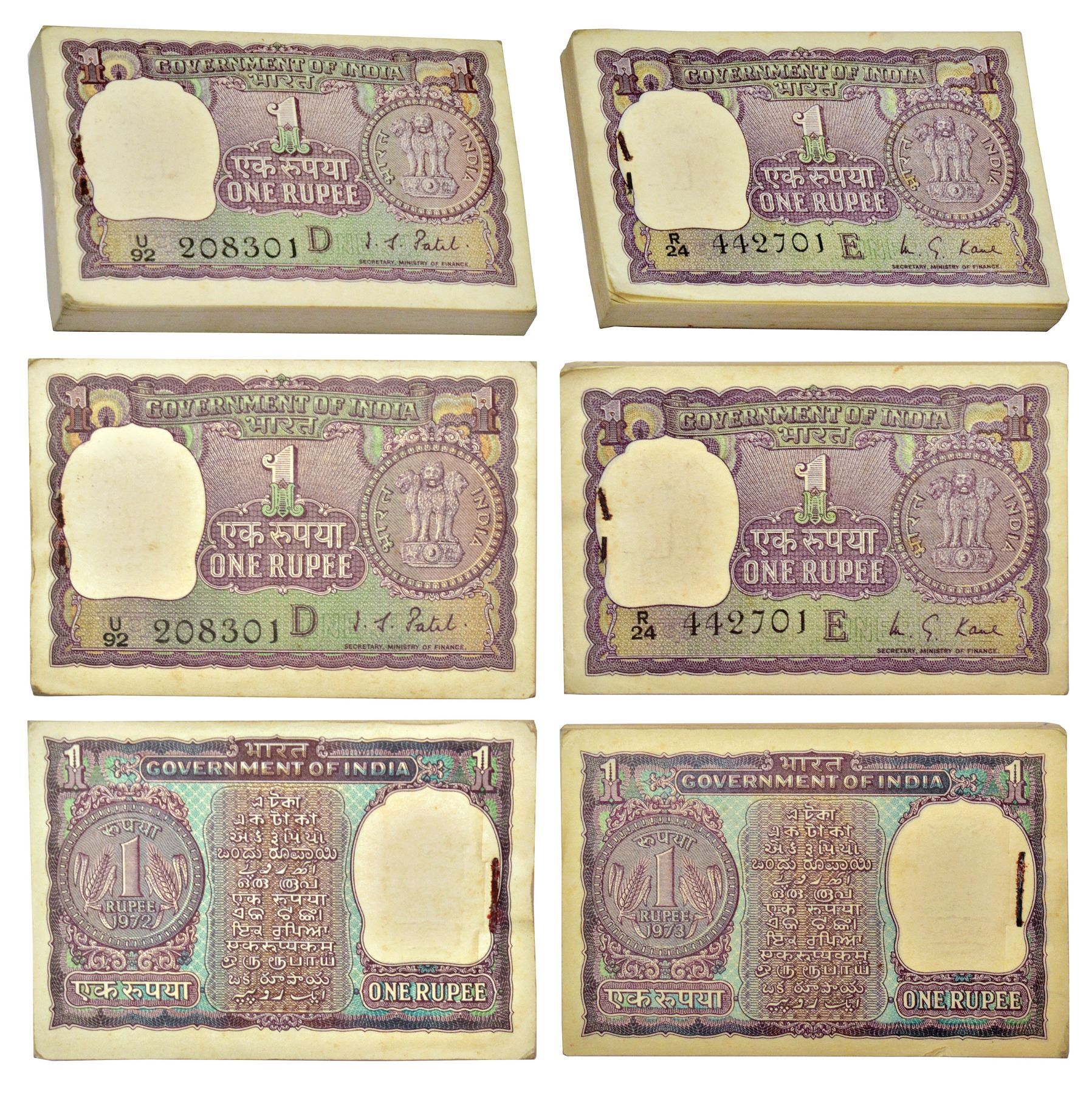 1 rupee, full packet of 100 notes (2), 1x 1972, signed by I.G. Patel, inset 'D', serial no.: U92 208301 to 208400, J&R 6.1.6.3G and 1x 1973, signed by M.G. Kaul, inset 'E', serial no.: R24 442701 to 442800 (with 786), J&R 6.1.6.4A. Slight rust in pin, (2 packets)