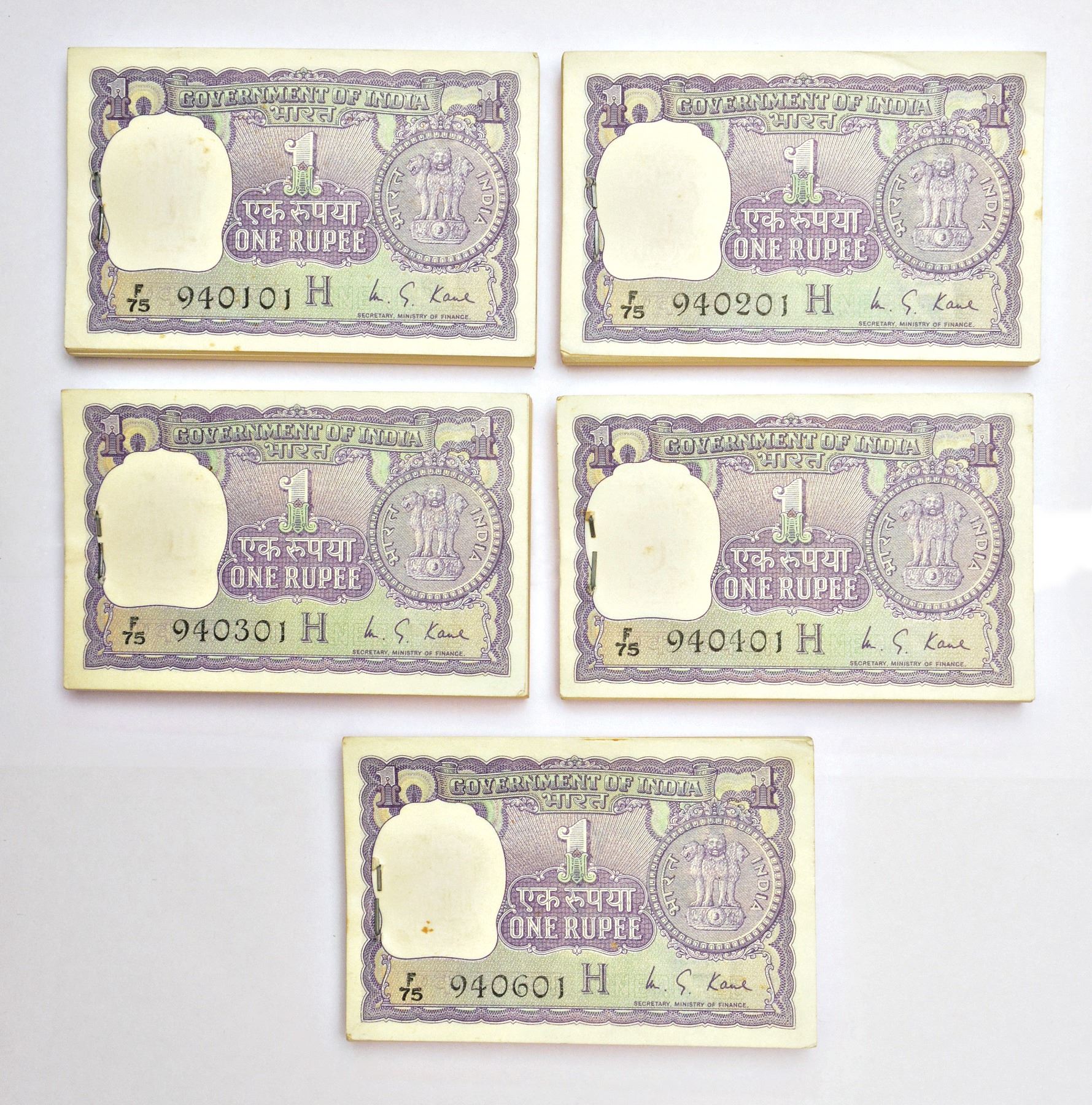 1 rupee, full packet of 100 notes (5), 1976, signed by M.G. Kaul, inset 'H', serial no.: F75 940101 to 940200, F75 940201 to 940300, F75 940301 to 940400, F75 940401 to 940500 and F75 940601 to 940700, J&R 6.1.6.4G, broken rim. (5 packets)