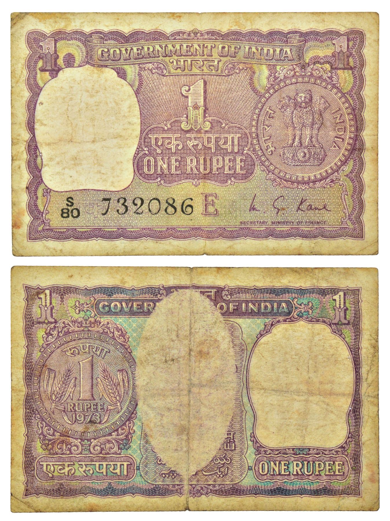 1 rupee, misprint, 1973, signed by M.G. Kaul, inset 'E', serial no.: S80 732086, some part not printed on reverse.