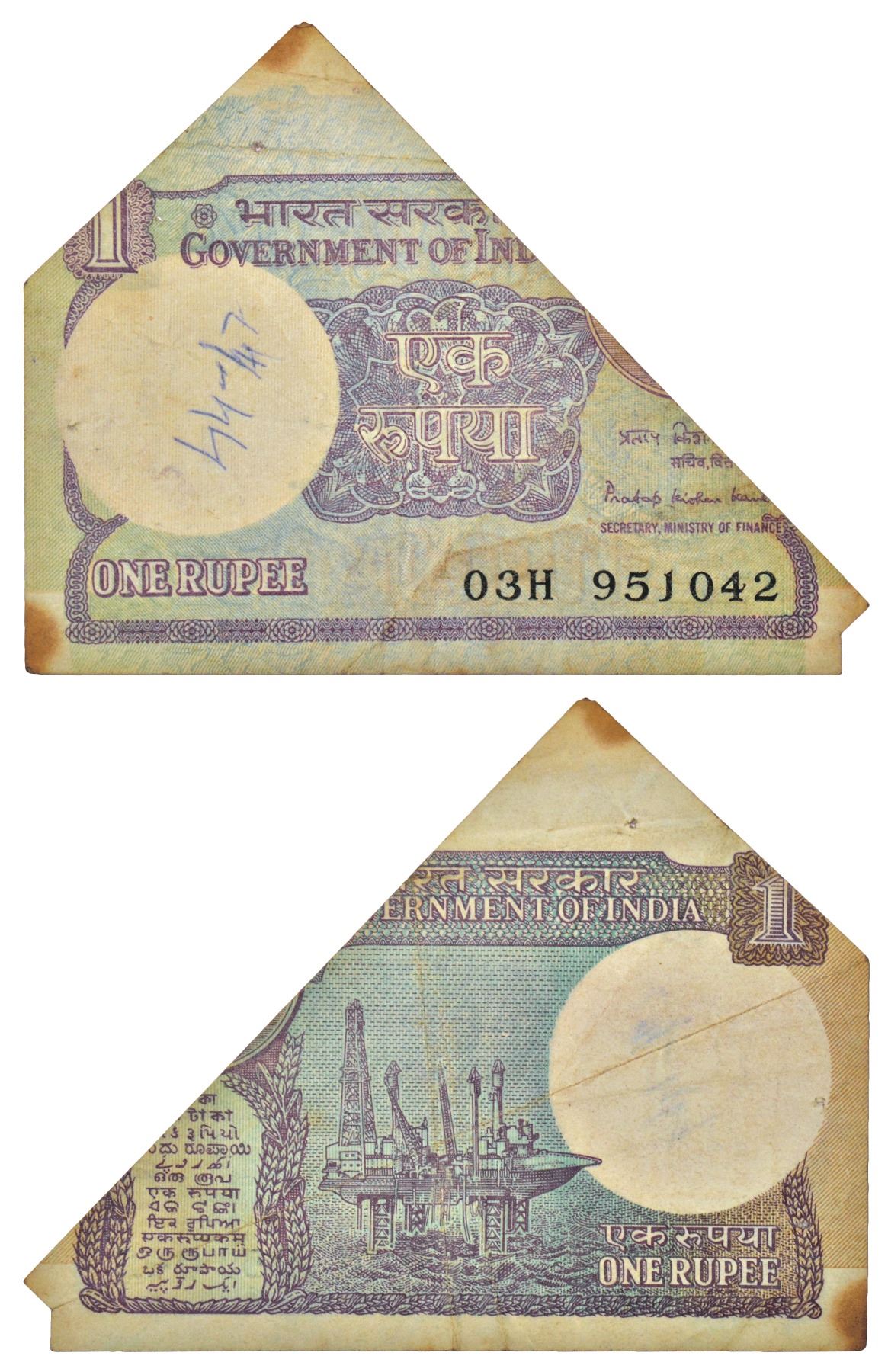 1 rupee, misprint, date cut, signed by Pratap Kishen Kaul, without inset, serial no.: 03H 951042, misaligned cutting, part of the sheet error.