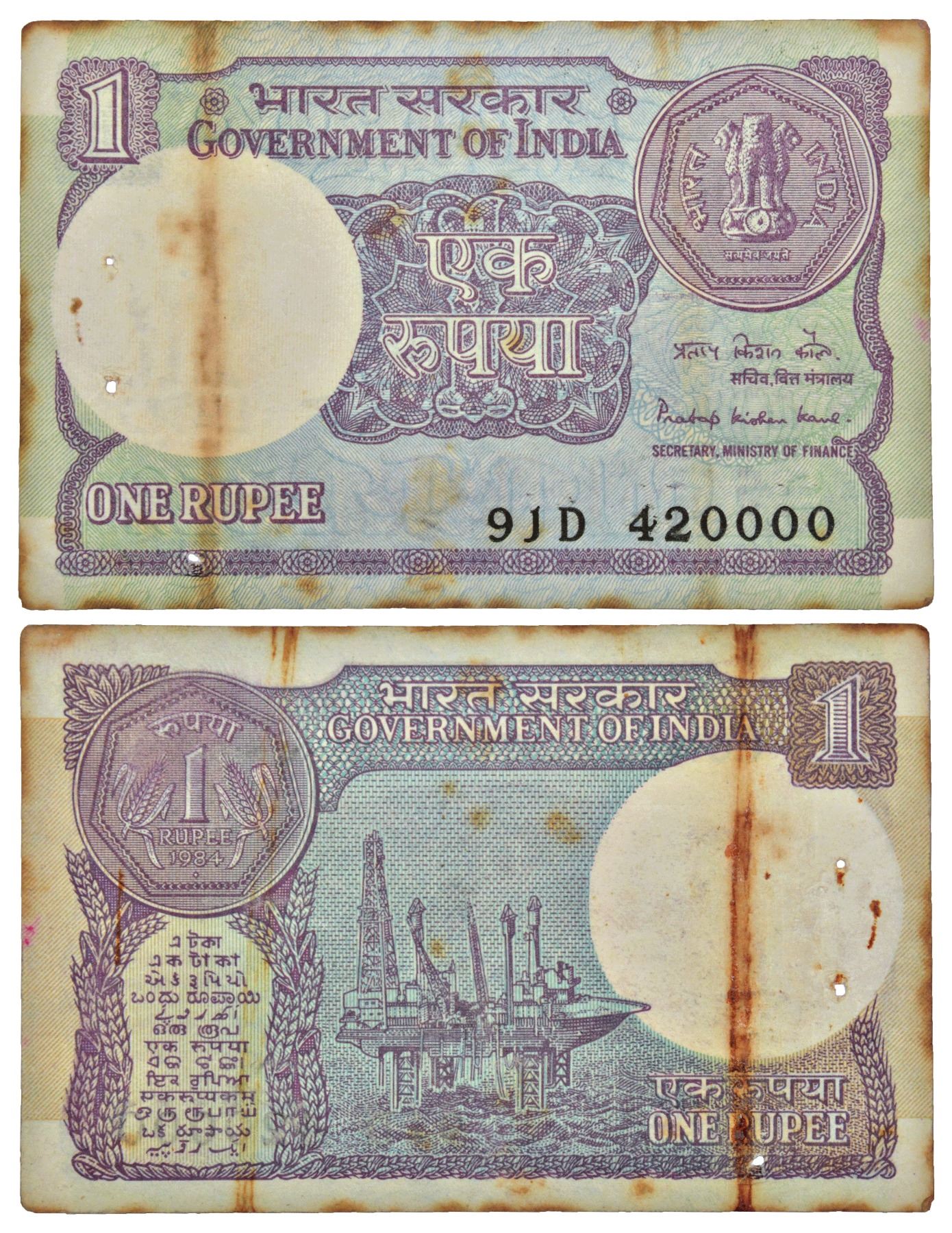1 rupee, semi fancy number, 1984, signed by Pratap Kishan Kaul, without inset, serial no.: 91D 420000, J&R 6.1.10.1B, stain marks.