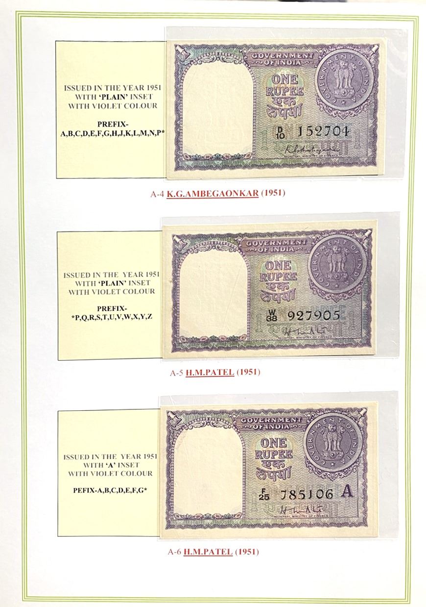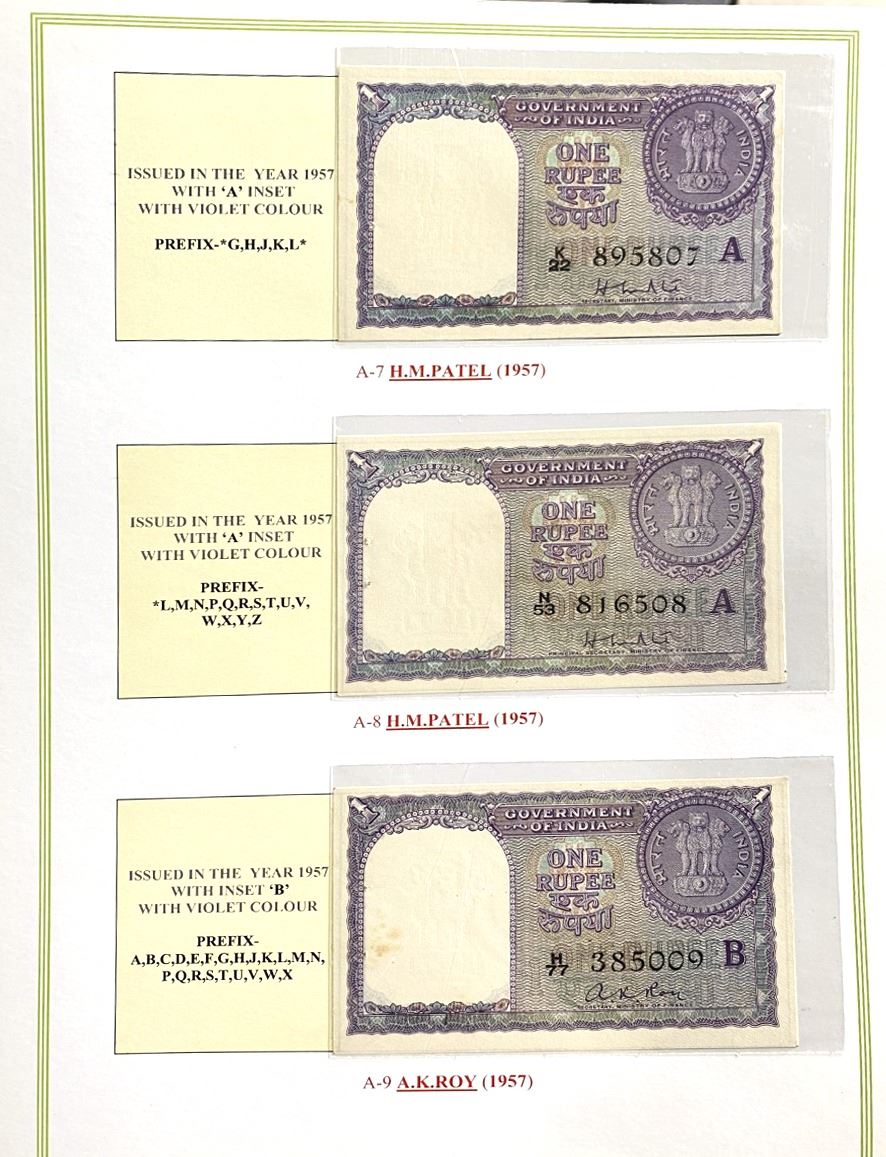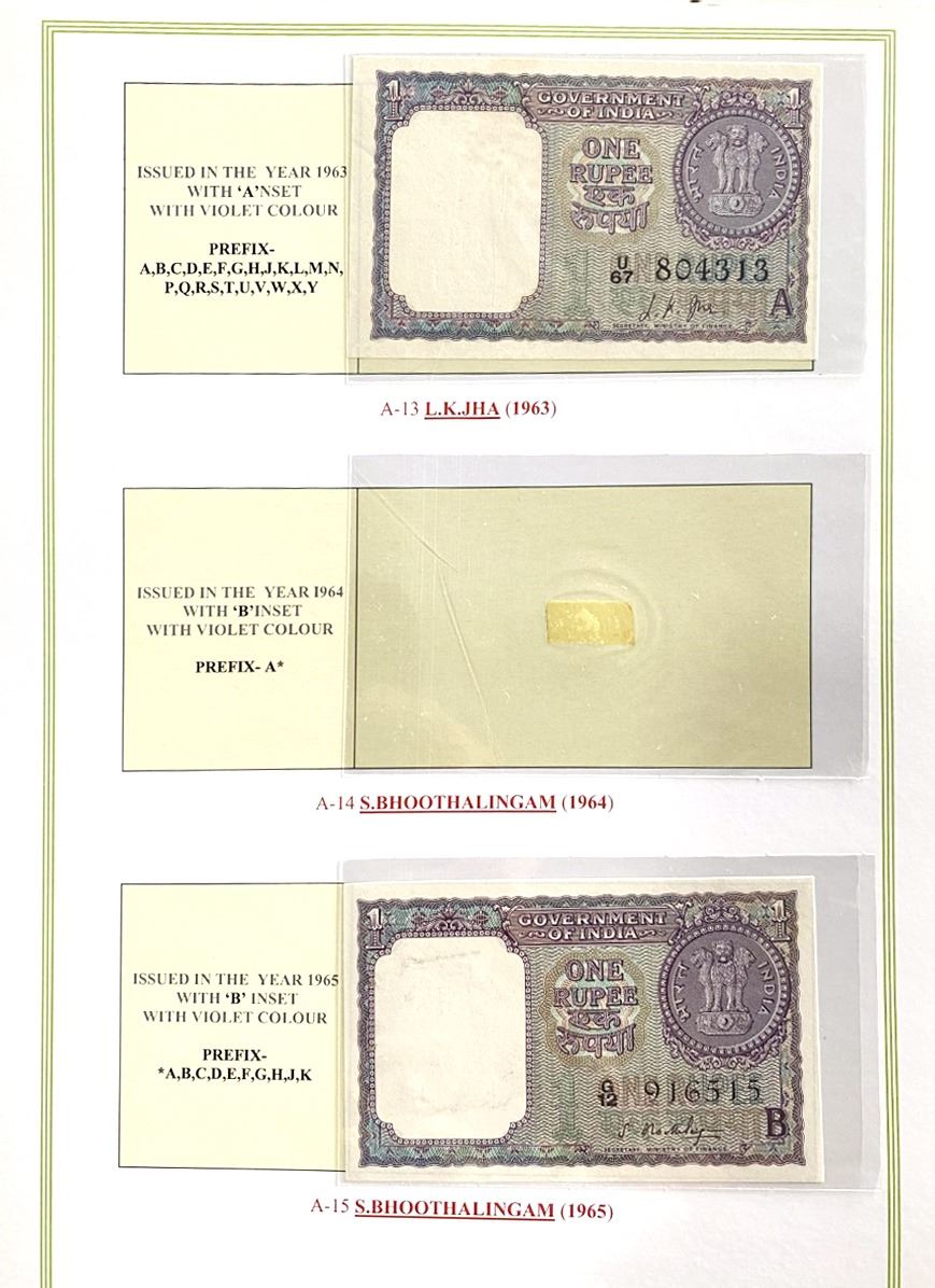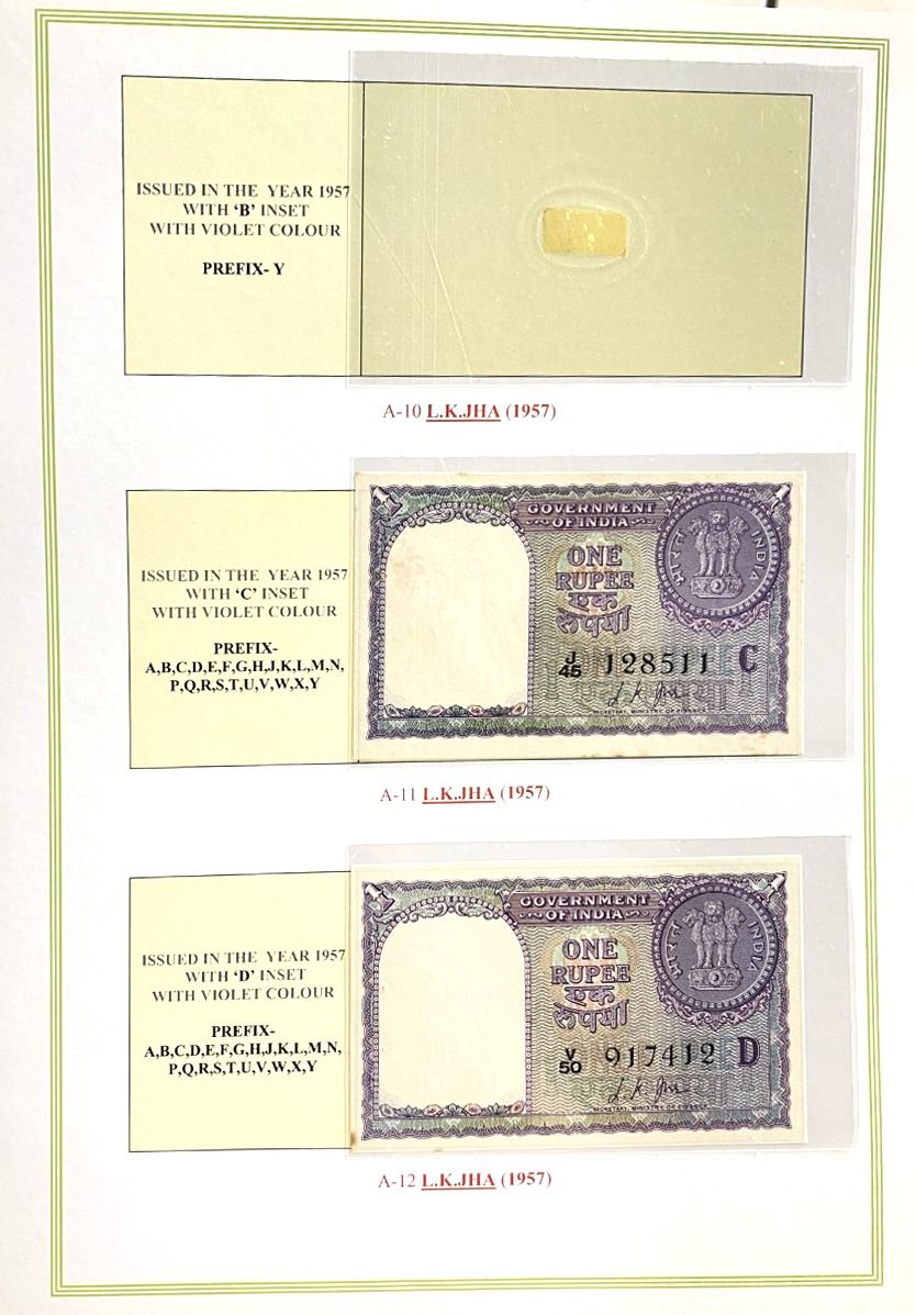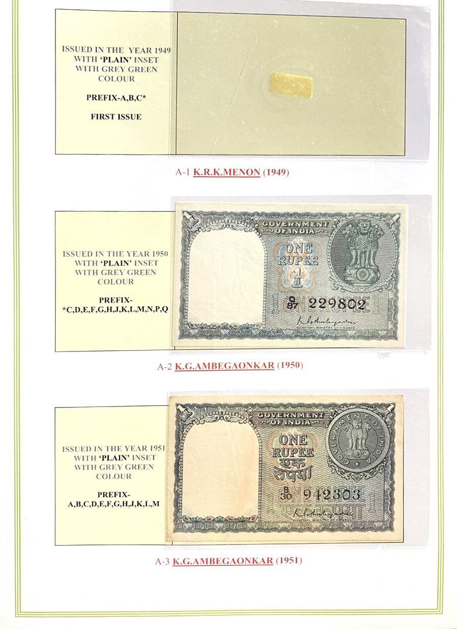 1 rupee, set of 56 different notes, 1950 to 1994, with different dates, types and signatures (except 1949 K.R.K. Menon, 1957 L.K. Jha 'B' and 1964, S.Bhoothalingam 'B'), 56 notes in printed spiral album, last 2 serial number of all notes are of their respective Ex Phila India number.