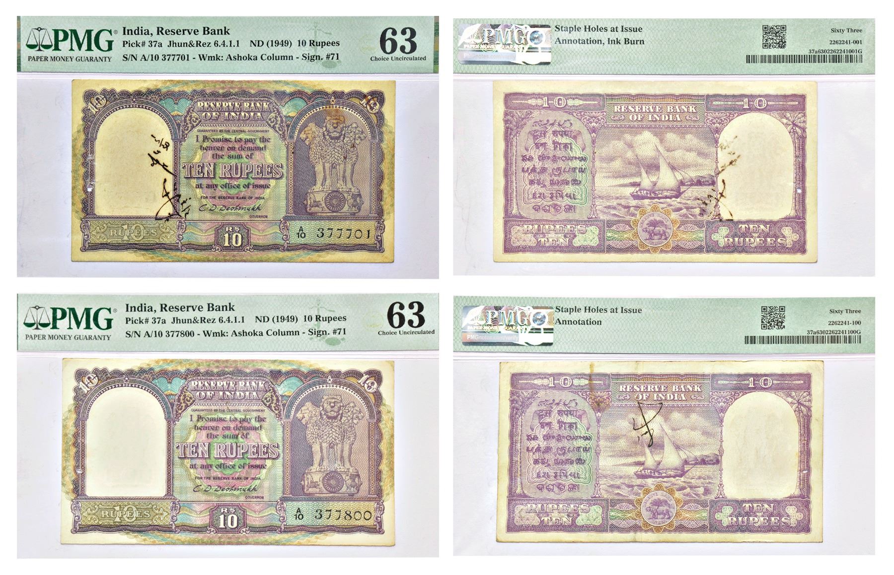 Paper Money: 10 rupees (2), Boat series, ND (1949), signed by C.D. Deshmukh, value in English in center, serial nos.: A10 377701 and 377800, J&R 6.4.1.1. (2 notes)