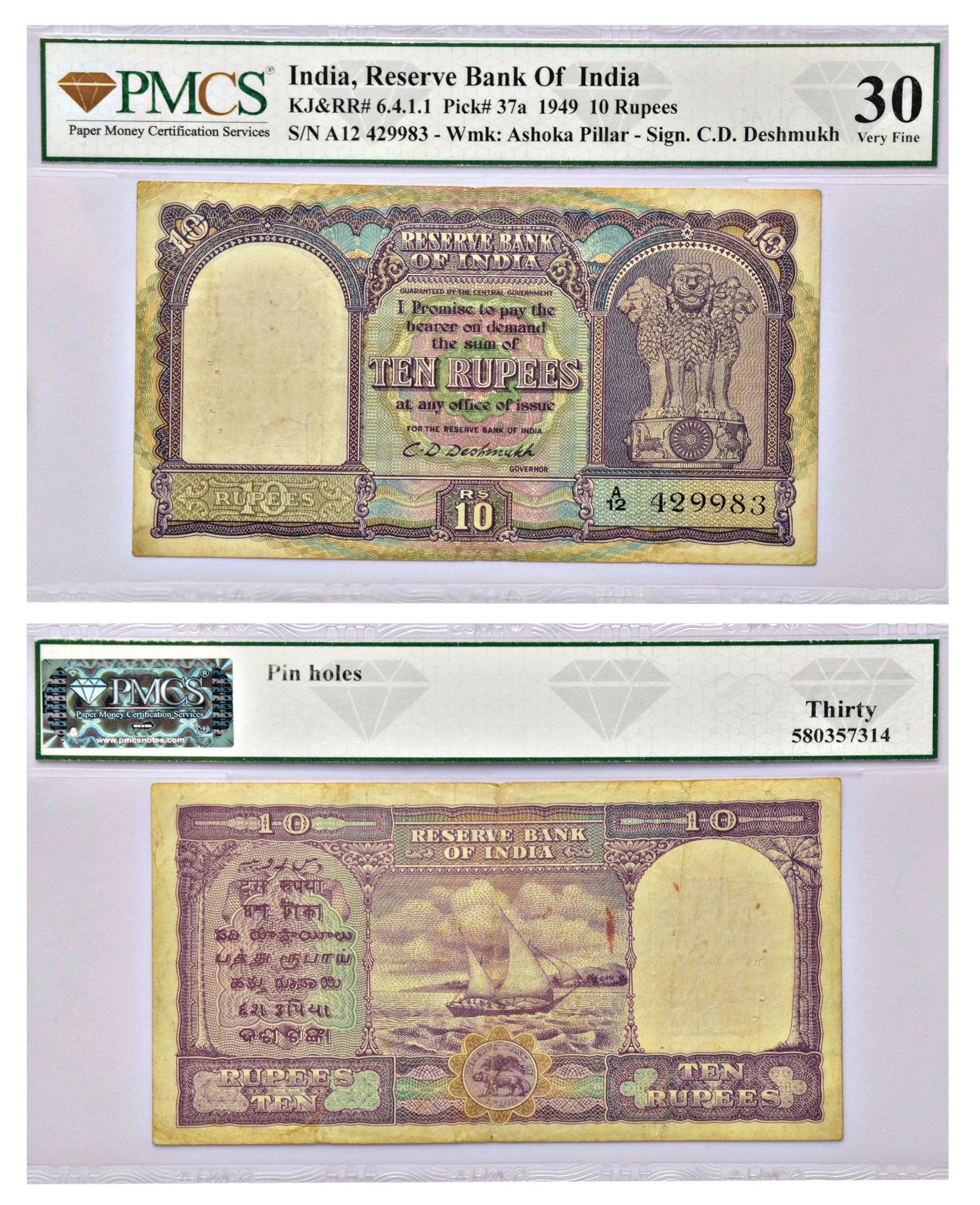 10 rupees, Boat series, ND (1949), signed by C.D. Deshmukh, value in English in center, serial no.: A12 429983, J&R 6.4.1.1.