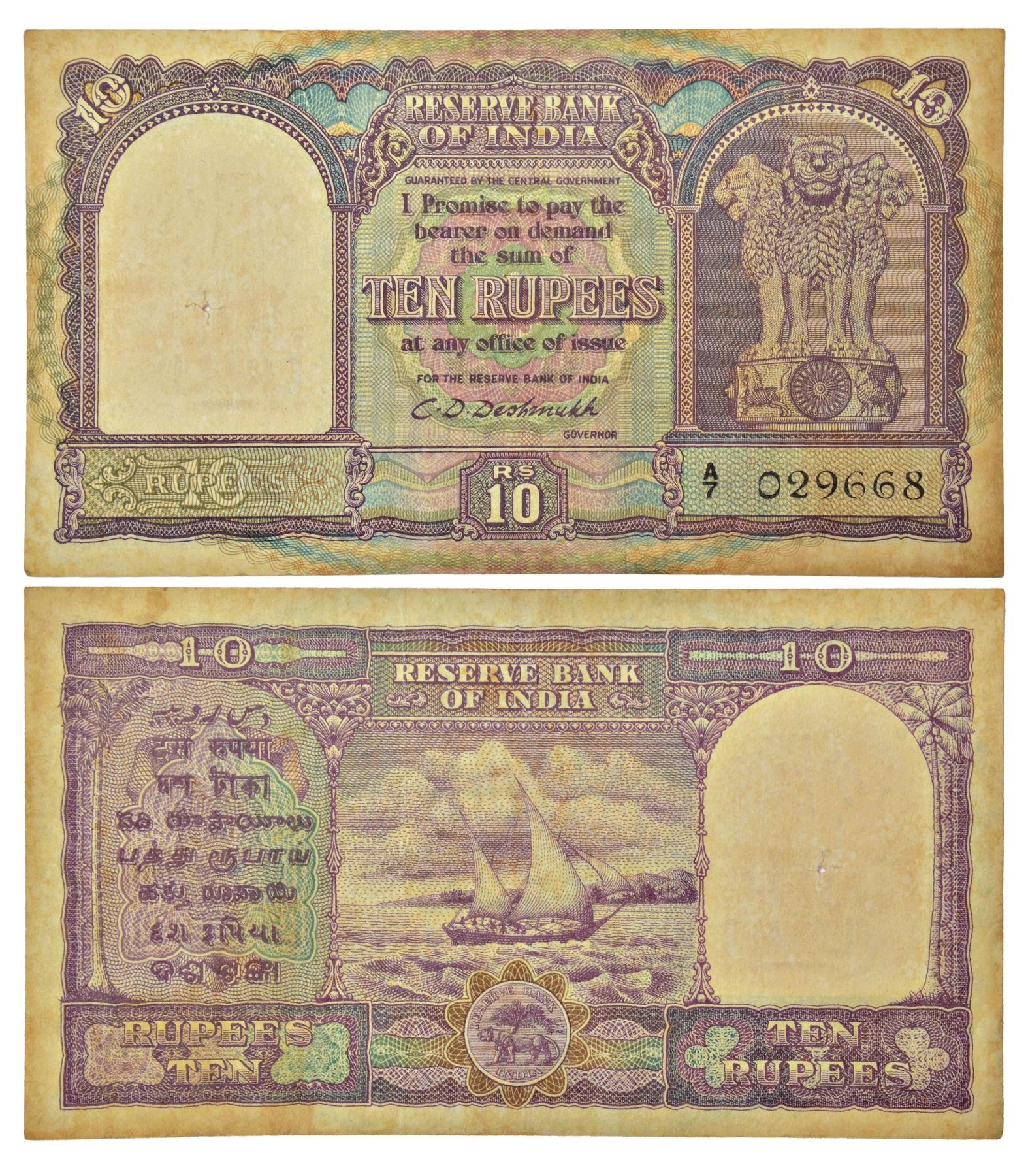 10 rupees, Boat series, ND (1949), signed by C.D. Deshmukh, value in English in center, serial no.: A7 029668, J&R 6.4.1.1.