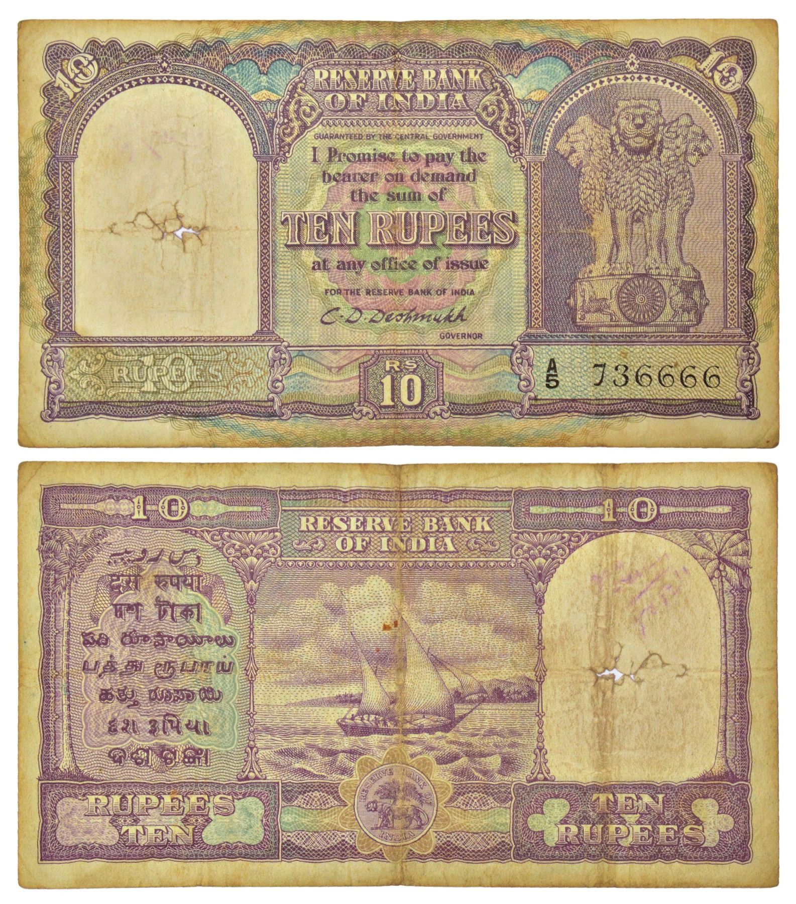 10 rupees, Boat series, ND (1949), signed by C.D. Deshmukh, value in English in center, serial no.: A5 736666, J&R 6.4.1.1.
