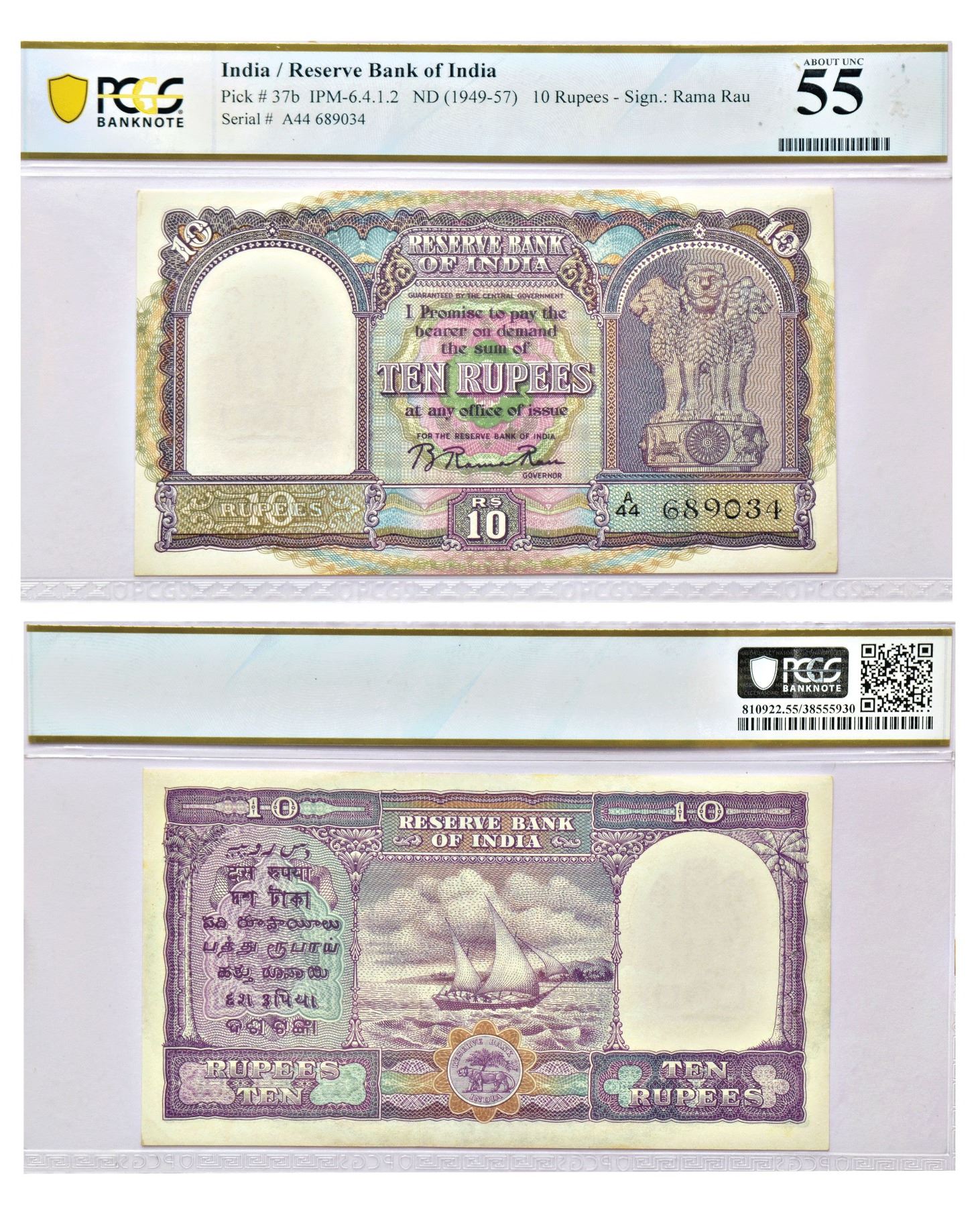 10 rupees, Boat series, ND (1950), signed by B. Rama Rau, without inset, value in English in center, serial no.: A44 689034, J&R 6.4.1.2.