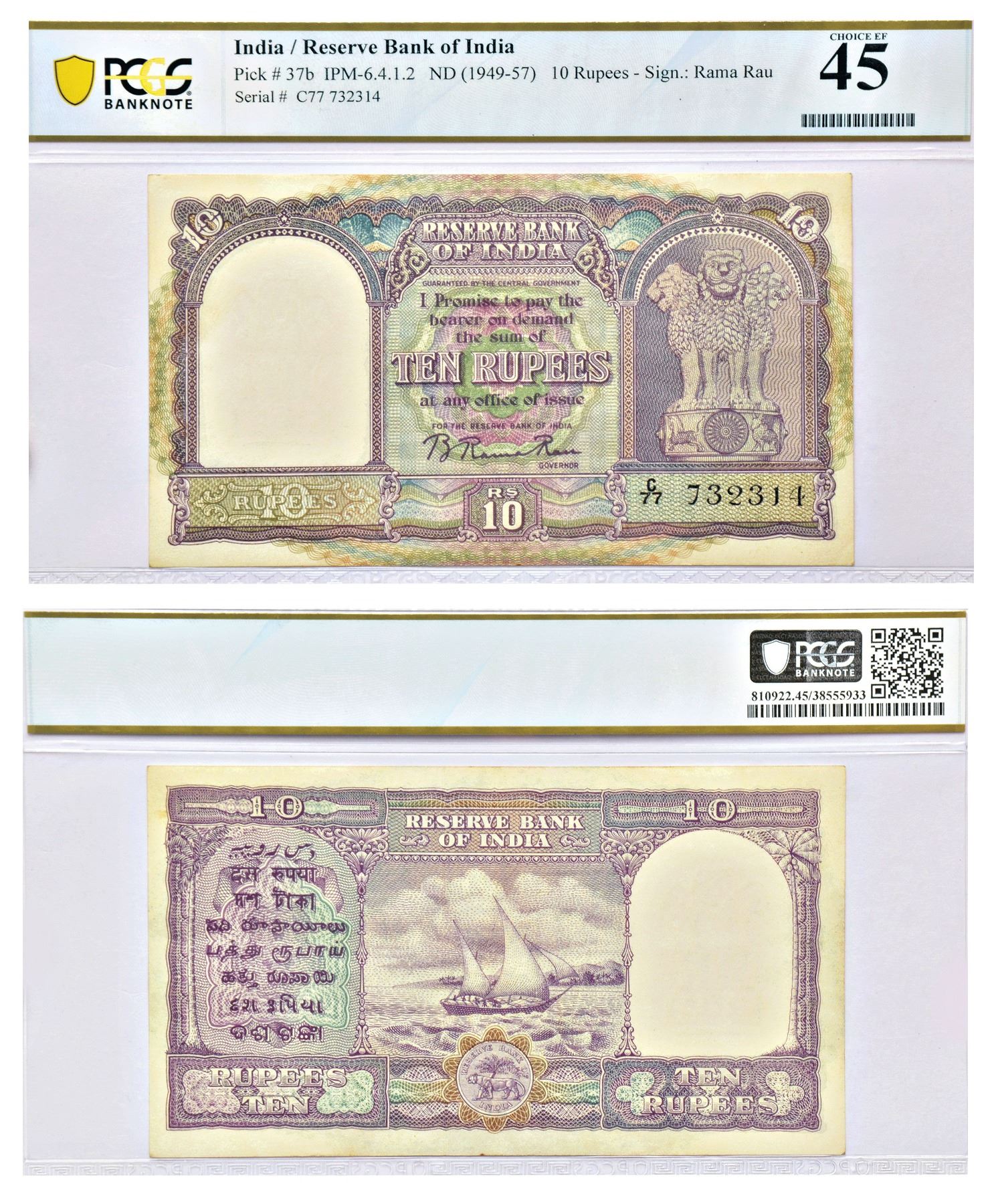 10 rupees, Boat series, ND (1950), signed by B. Rama Rau, without inset, value in English in center, serial no.: C77 732314, J&R 6.4.1.2.