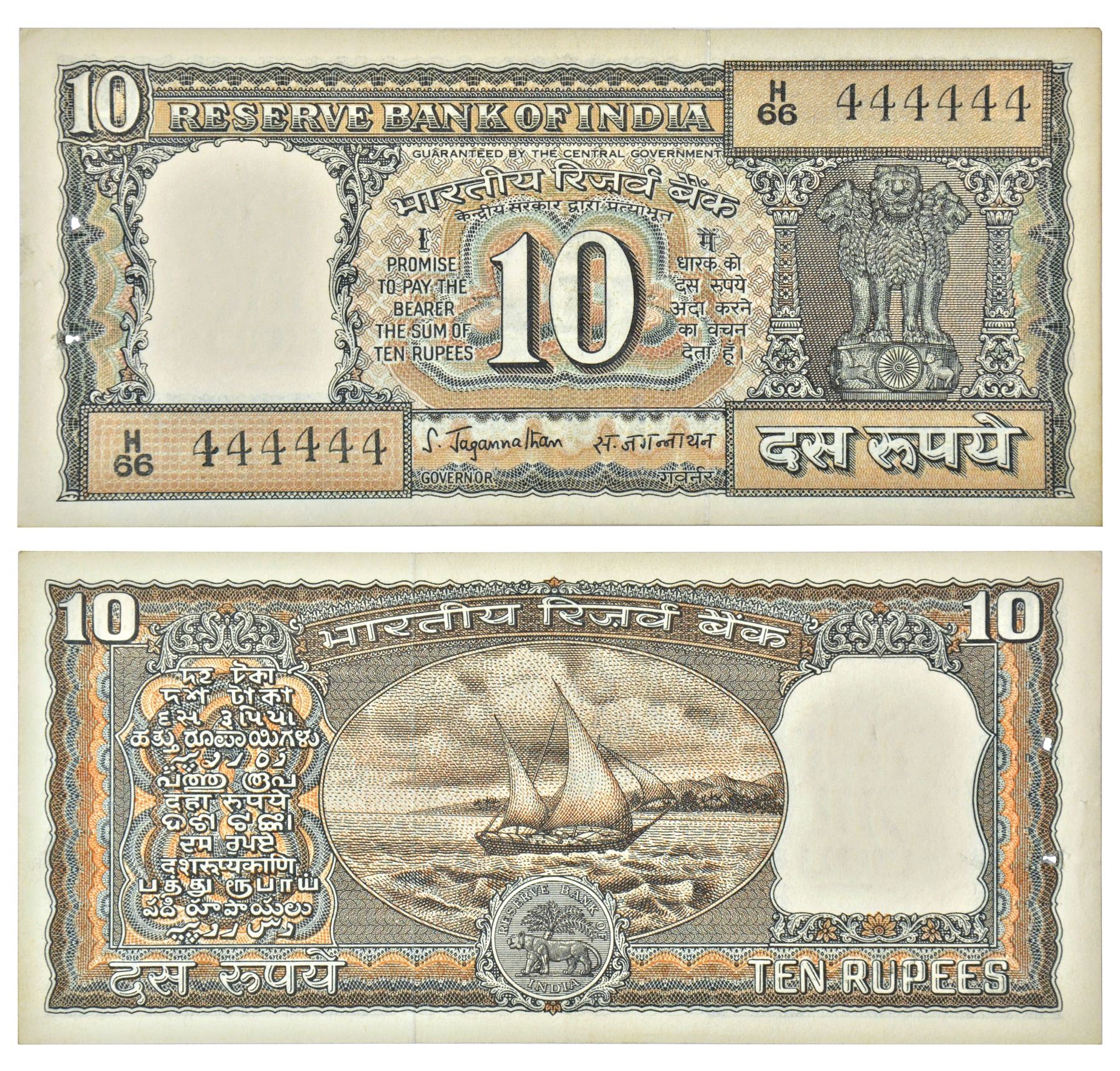 10 rupees, fancy number, Boat series, ND (1970-1975), signed by S. Jagannathan, without inset, serial no.: H86 444444. J&R 6.4.8.1A.