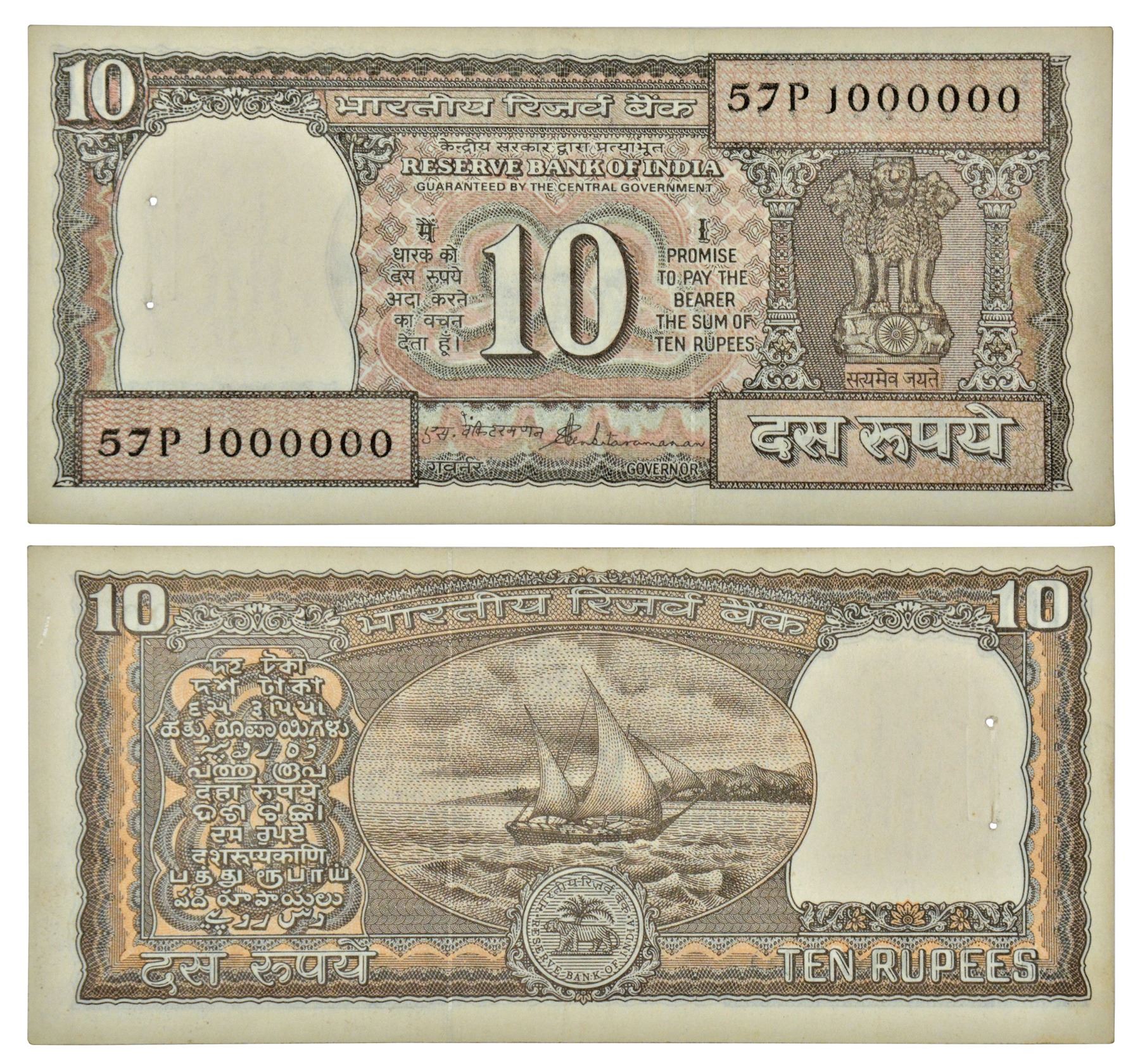 10 rupees, fancy number, Boat series, ND (1990-1992), signed by S. Venkitaramanan, without inset, serial no.: 57P 1000000 (1 million). J&R 6.4.10.2B.