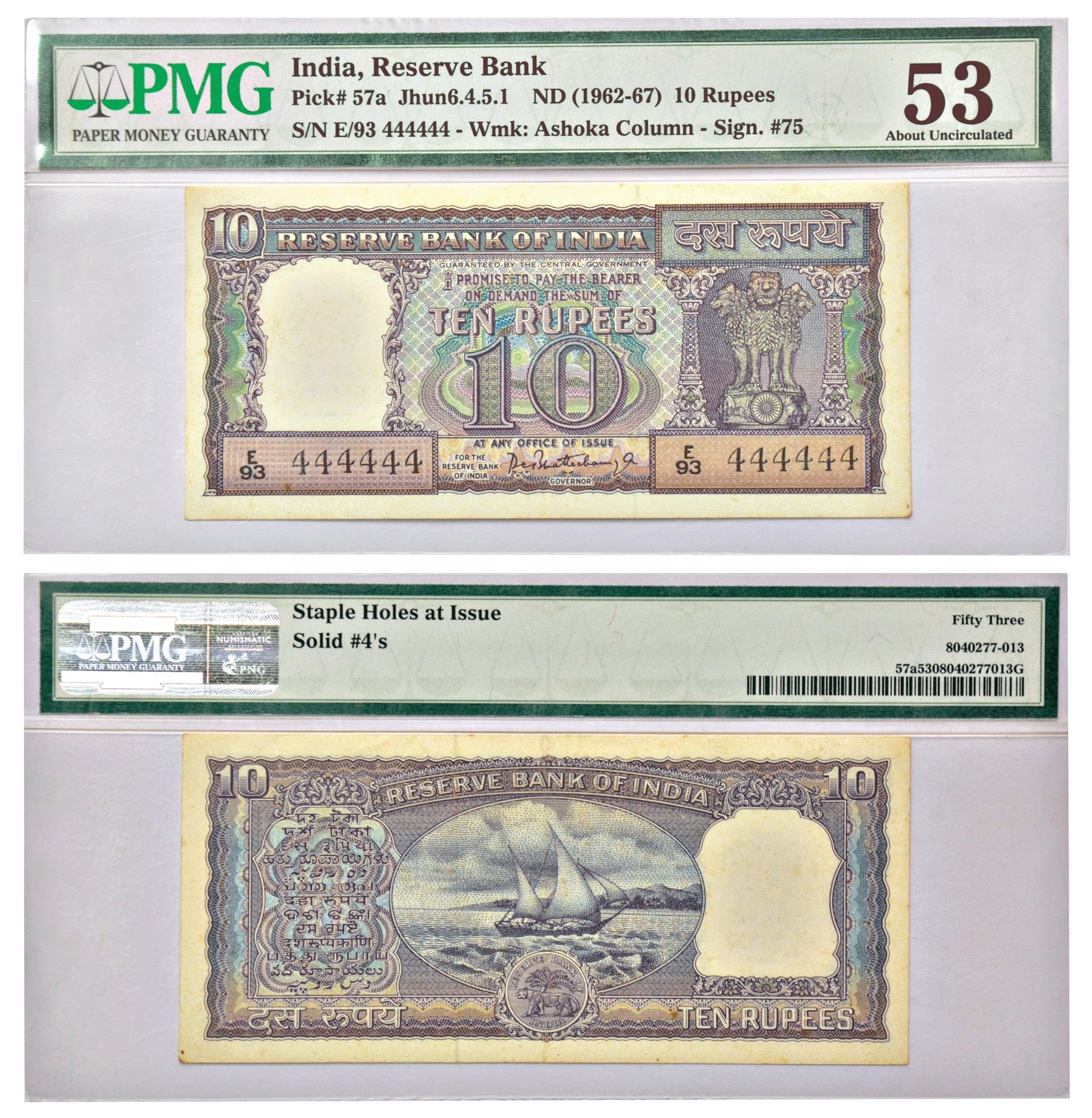 10 rupees, fancy number, Diamond series, ND (1962-1967), signed by P.C. Bhattacharya, without inset, serial no.: E93 444444. J&R 6.4.5.1.
