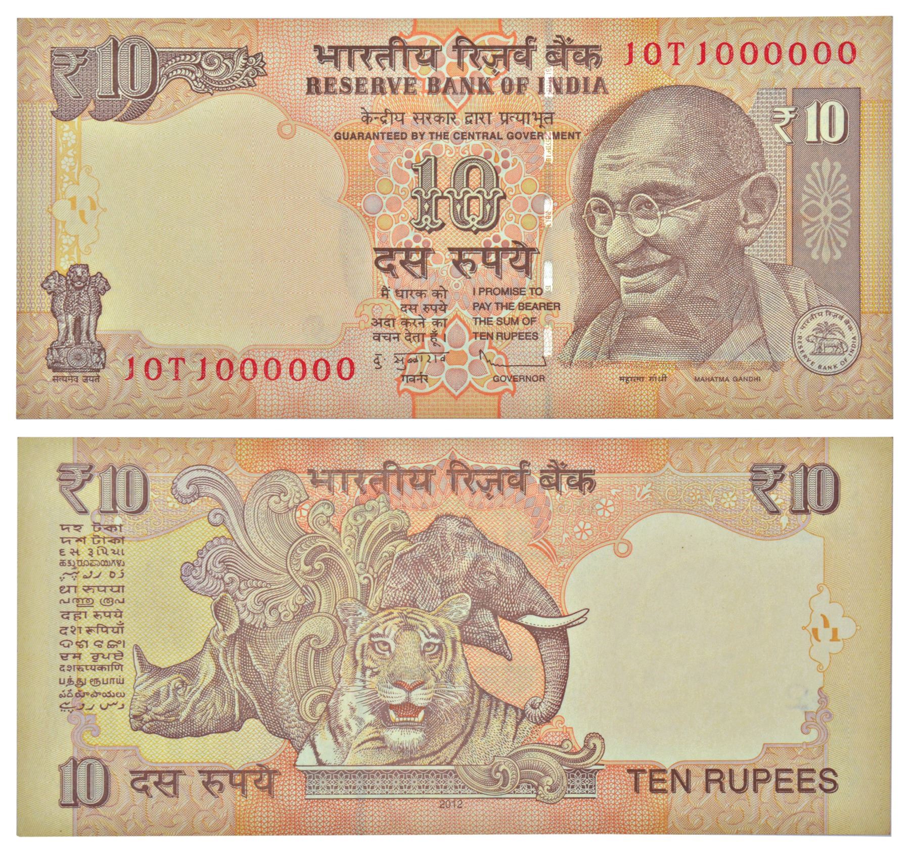 10 rupees, fancy number, Gandhi series, 2012, signed by D. Subbarao, without inset, serial no.: 10T 1000000 (super fancy).